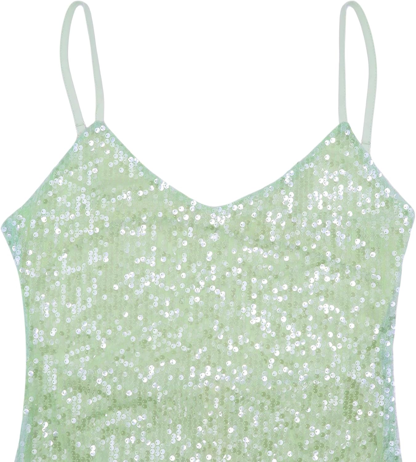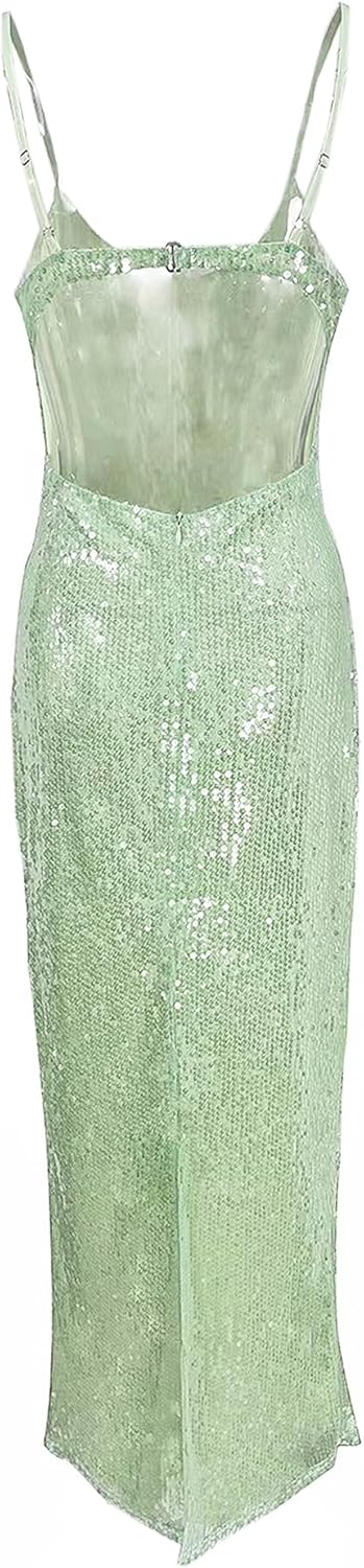 - Features: All covered sequins, shiny and sparkle. Sleeveless, spaghetti shoulder strap, back split hem, midi length, this chic bodycon dress is perfect for fashion-forward women looking to make a statement