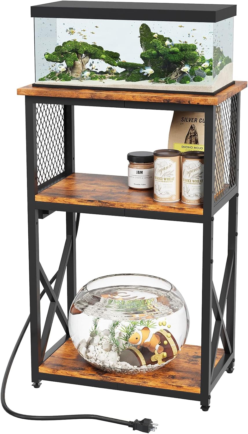 10 Gallon Fish Tank Stand with Power Outlet, 3 Tier Aquarium Stand with Shelf, Turtle/Reptile Tank Stand for Home Office,Adjustable Boards, 20.47”L11.42”W30.91”H, Retro Brown