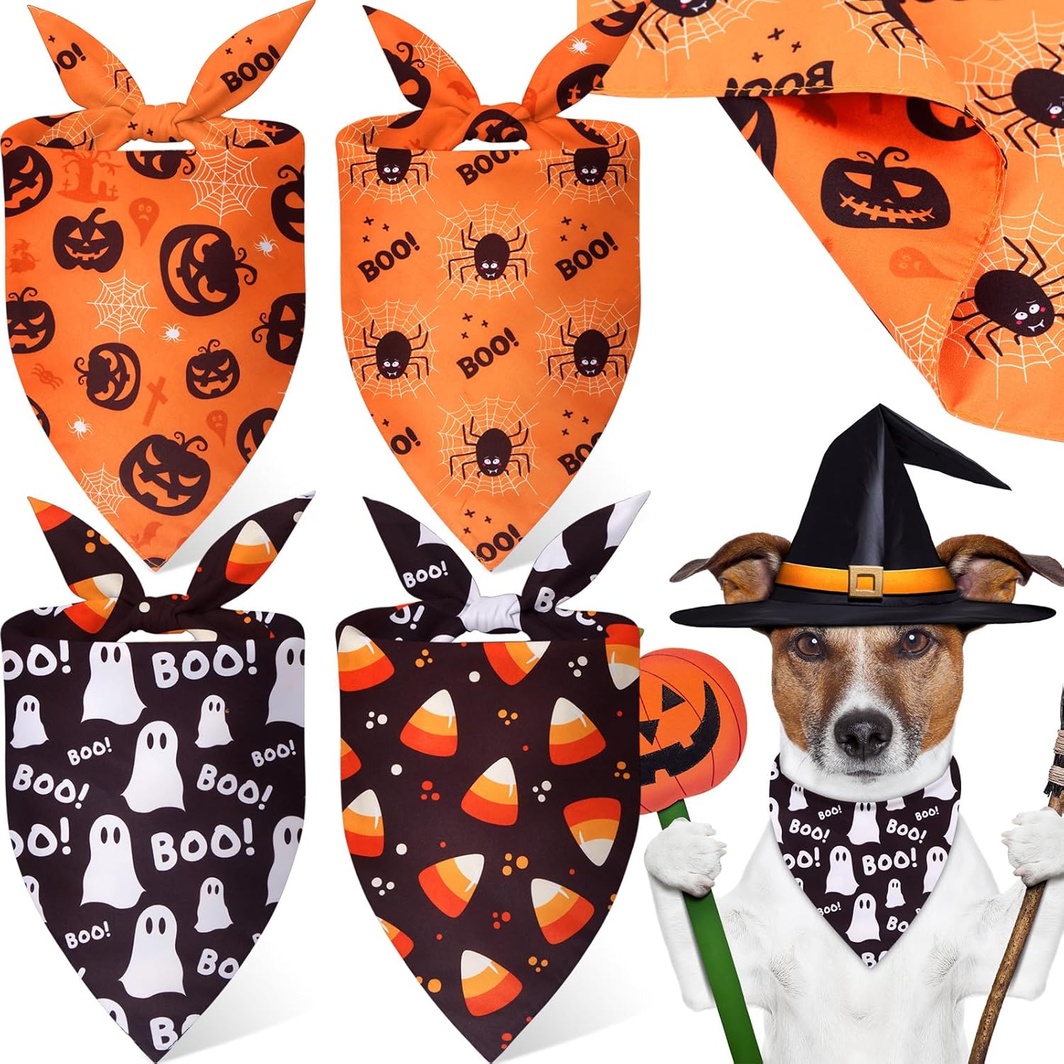 - Reversible Design: each Halloween dog bandana has a two-sided design, Printed with ghost, corn candy, pumpkin and spider patterns; So your lovely dogs will have 4 fresh new looks