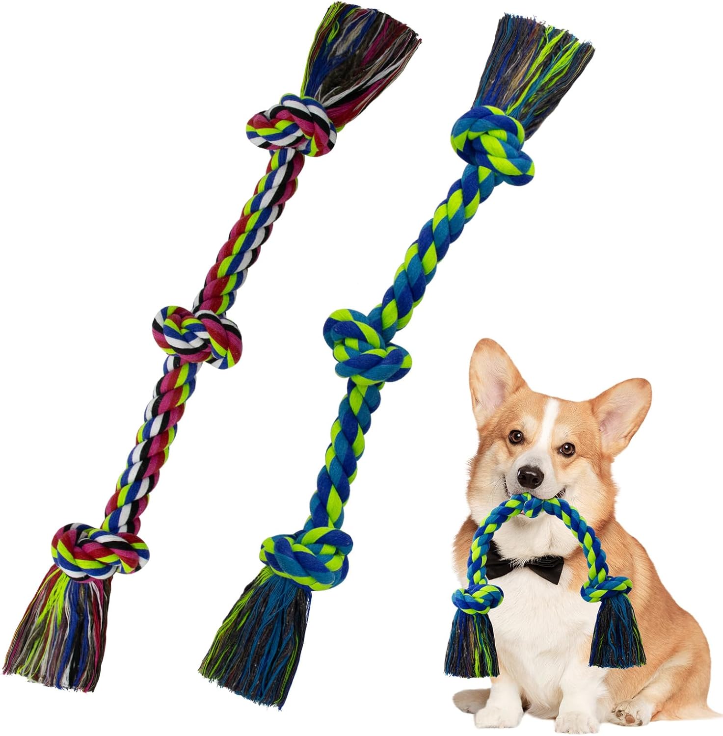 - Puppy Dog Rope Toy: Value 2 Pack, multicolor with 3 knots, 18in/45cm long, weight 130g for each one, intended for medium and small dogs (not for large dogs), the knots of the dog chew rope make it easier to biting, chewing, shaking and tugging