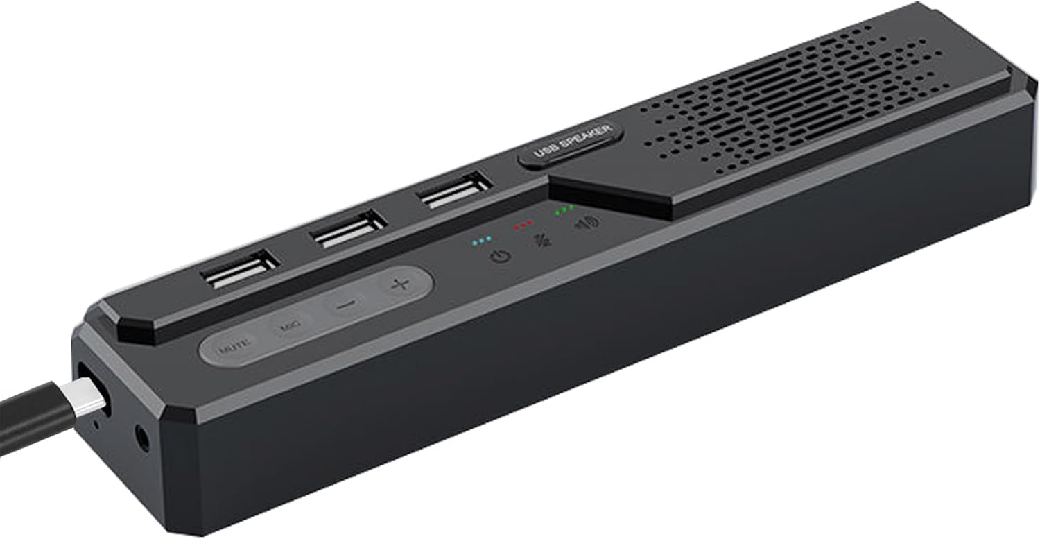 - 【3-in-1 USB Computer Speaker with Microphone】Combine speaker, microphone, usb hub, audio port, and control buttons in one.This USB computer speaker has a built-in high-performance microphone.Conduct professional conferences with our speaker phone. It has everything you’ll need to sound good.This soundbar features a 3-port USB hub that can be connected to devices with USB output.The extended 1.8m cable allows for perfect setup and easy access to out-of-the-way ports.