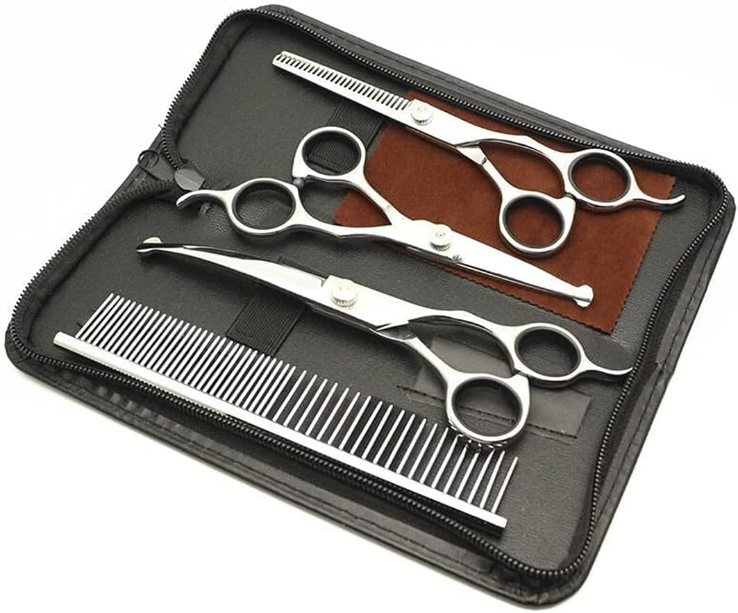 - Complete kit for comprehensive grooming – Dog Grooming Scissors Set with 4.5″ Safety Round Tips Straight Scissors + 7.5″ Profeissonal Thinning Scissors + 7.5″ Safety Round Tips Curved Down Scissors + Bonus Grooming Comb + Stylish black case. Everything you need in one convenient place.It is also a perfect gift for your friends.