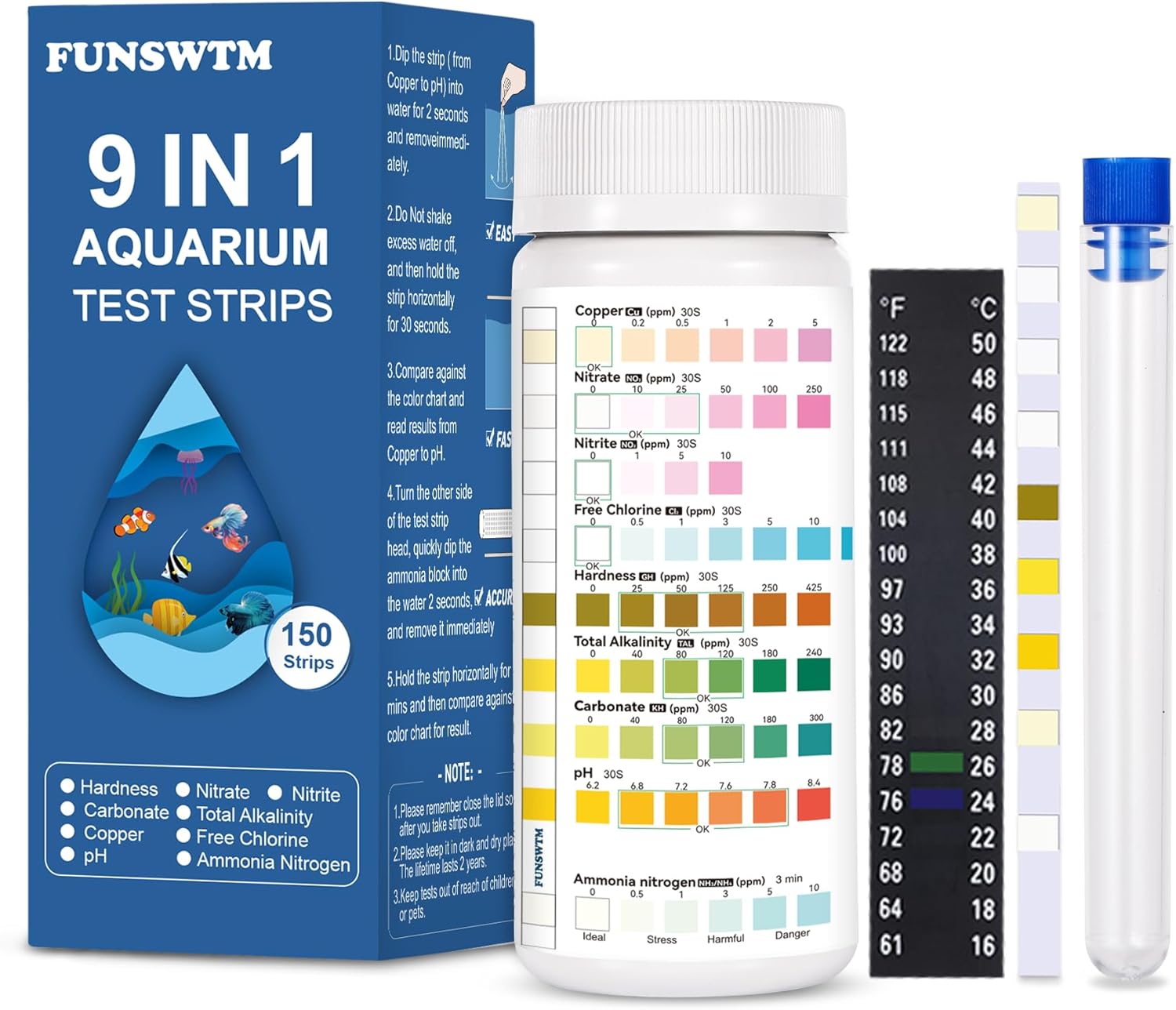 • Comprehensive 9-in-1 Test Strips: FUNSWTM aquarium test strips accurately test 9 essential water parameters including Ammonia, pH, Nitrate, Chlorine, Nitrite, Hardness, Alkalinity, and Copper for both freshwater and saltwater aquariums.