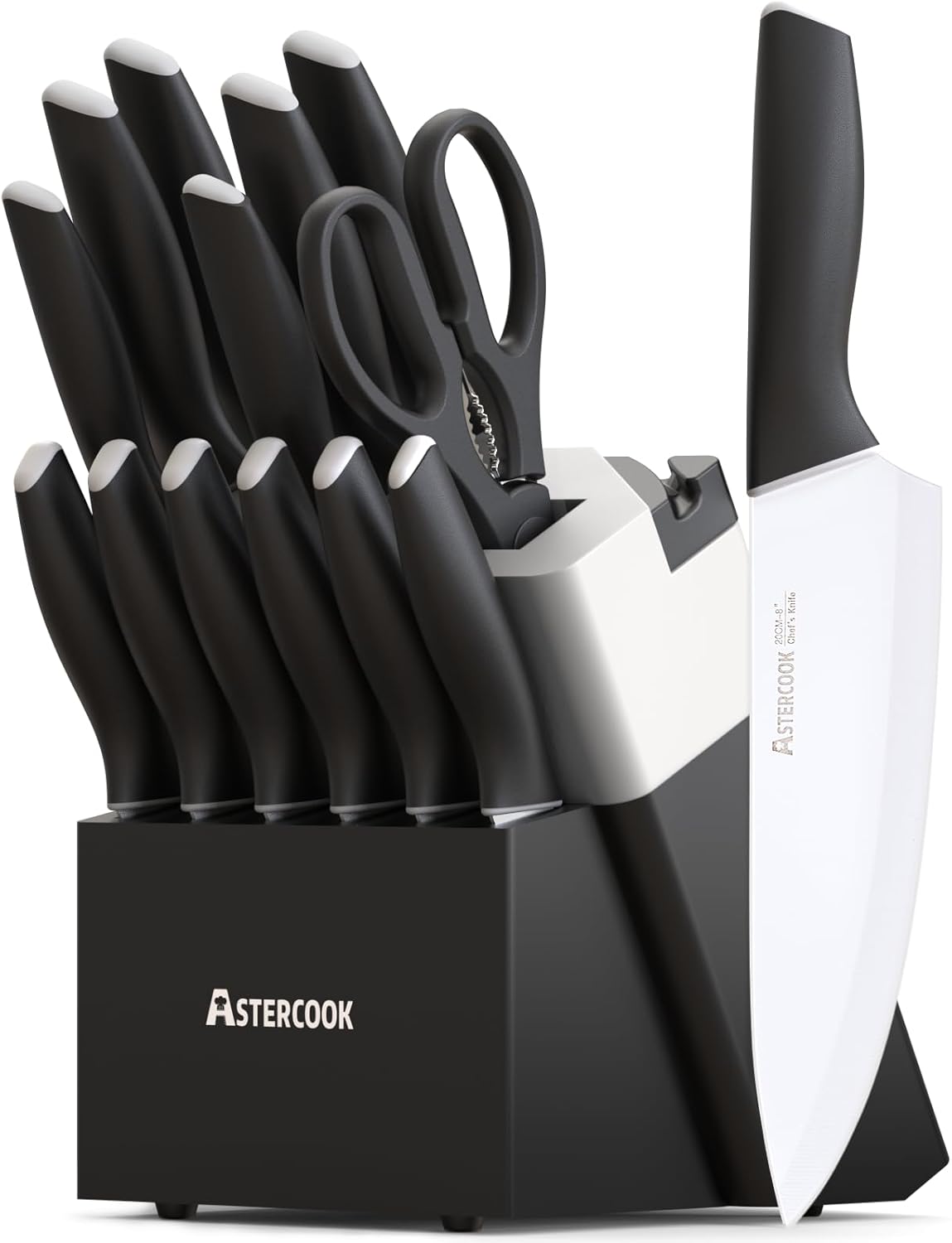Astercook Knife Set, Kitchen Knives with Block and Sharpener 15 Pcs German Stainless Steel Knives Sharp Blade Dishwasher Safe Deba Knives with Ergonomic Handle, Elegant Black