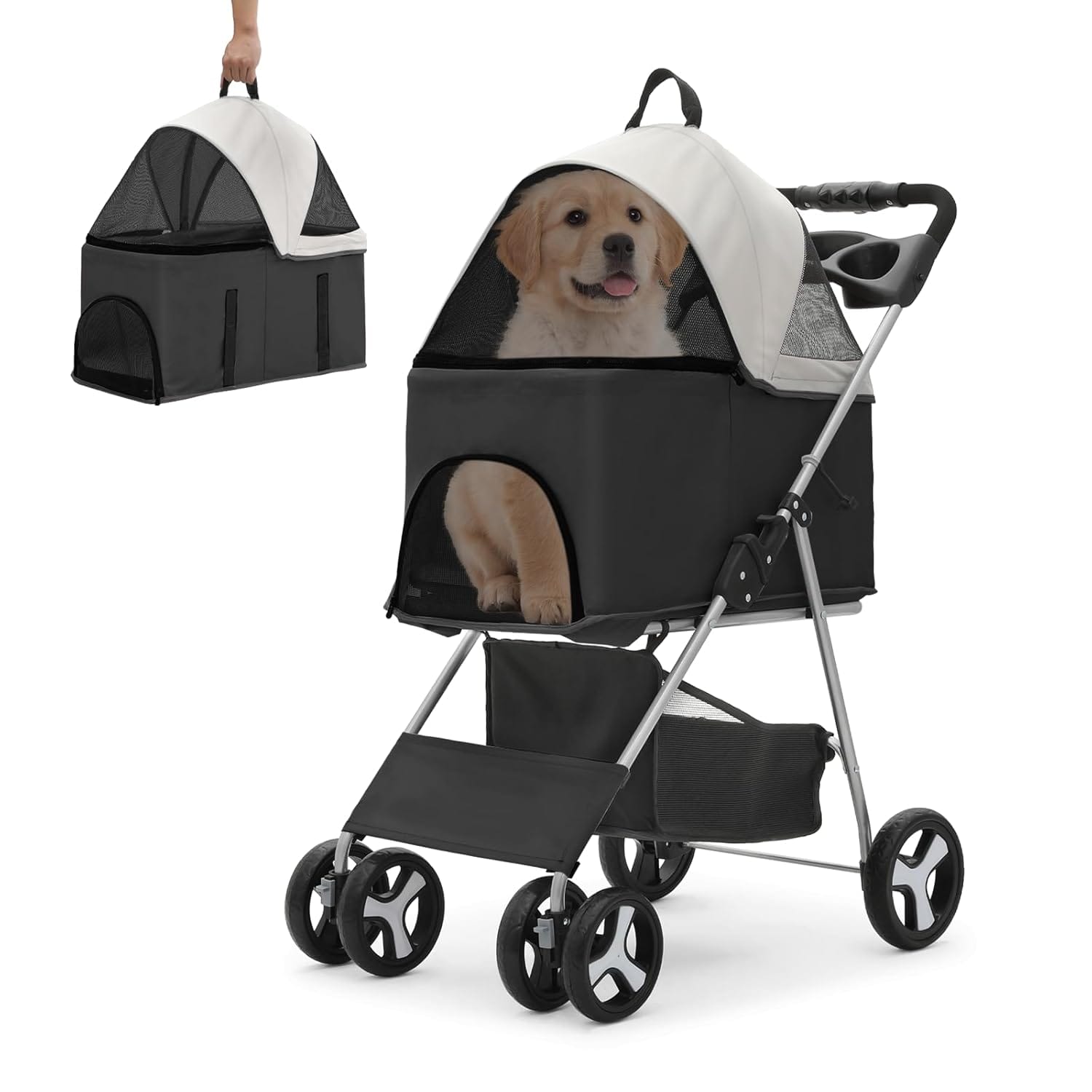 - Generous Storage Options: Our pet cart boasts multiple storage solutions, including a convenient cup holder tray, a secure back pocket, and a spacious bottom storage area, providing ample room for your pet’s essentials. It collapses into a compact size for convenient transport and is lightweight for easy carrying wherever you go.