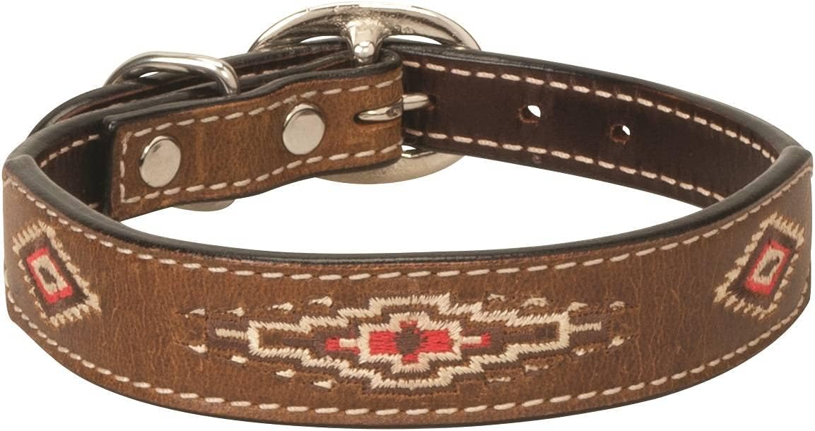 Aztec Dog Collar, Brown with Red Accents, Leather, 15 inches by 3/4 inches, Aztec-inspired Embroidery, Non-rust Stainless Steel Hardware