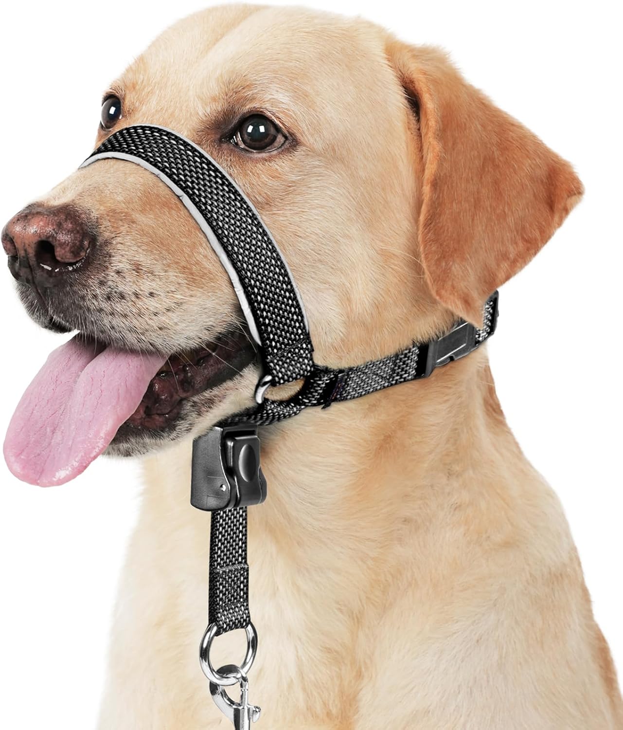 - Stays in place: The adjustable O-rings on both sides and the triangular structure of the jaw, plus a plastic clip under the chin of the dog head collar, can easily adjust the nose ring. These designs make the head halter for dogs not easy to fall off
