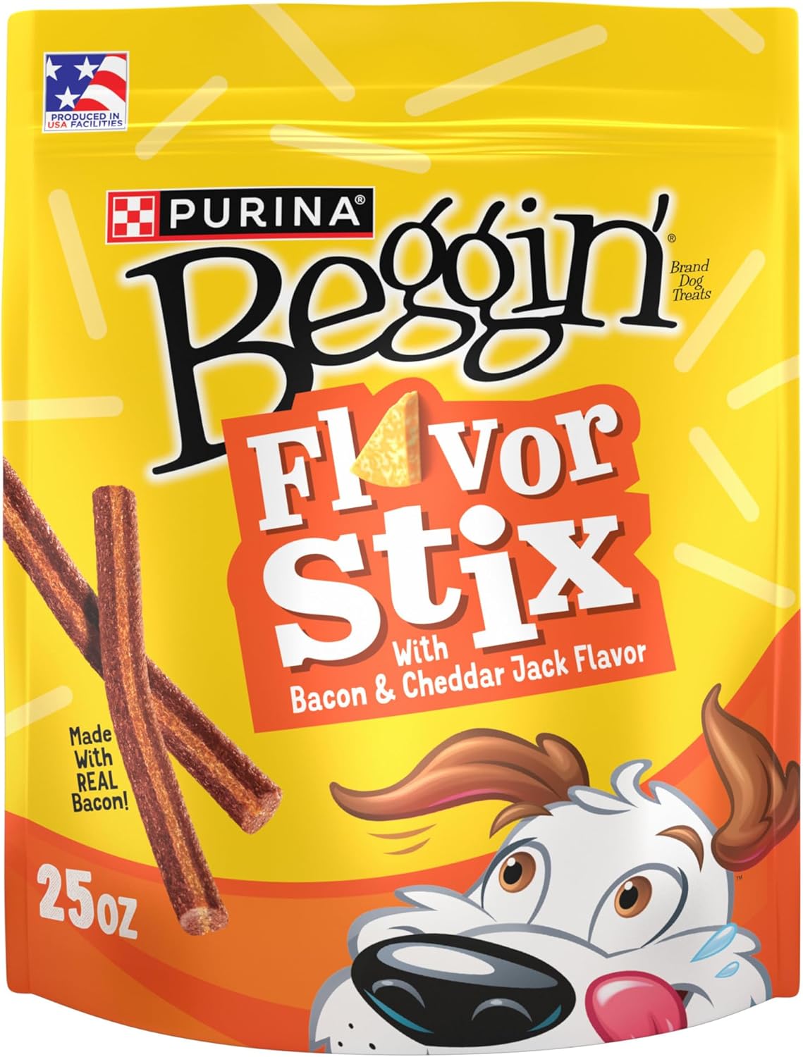 - Purina Beggin’ Flavor Stix With Bacon and Cheddar Jack Flavor dog snacks are proudly crafted in US facilities