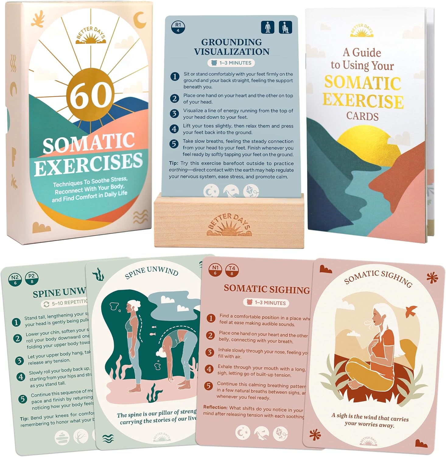 - [Restore Calm and Find Ease] Stress and tension can build up, leaving you feeling overwhelmed. This somatic exercise deck offers 60 practices to help you release tension, find calm, and reconnect with your body. Whether you seek grounding, energy, or relaxation, these exercises make it simple to support your well-being.