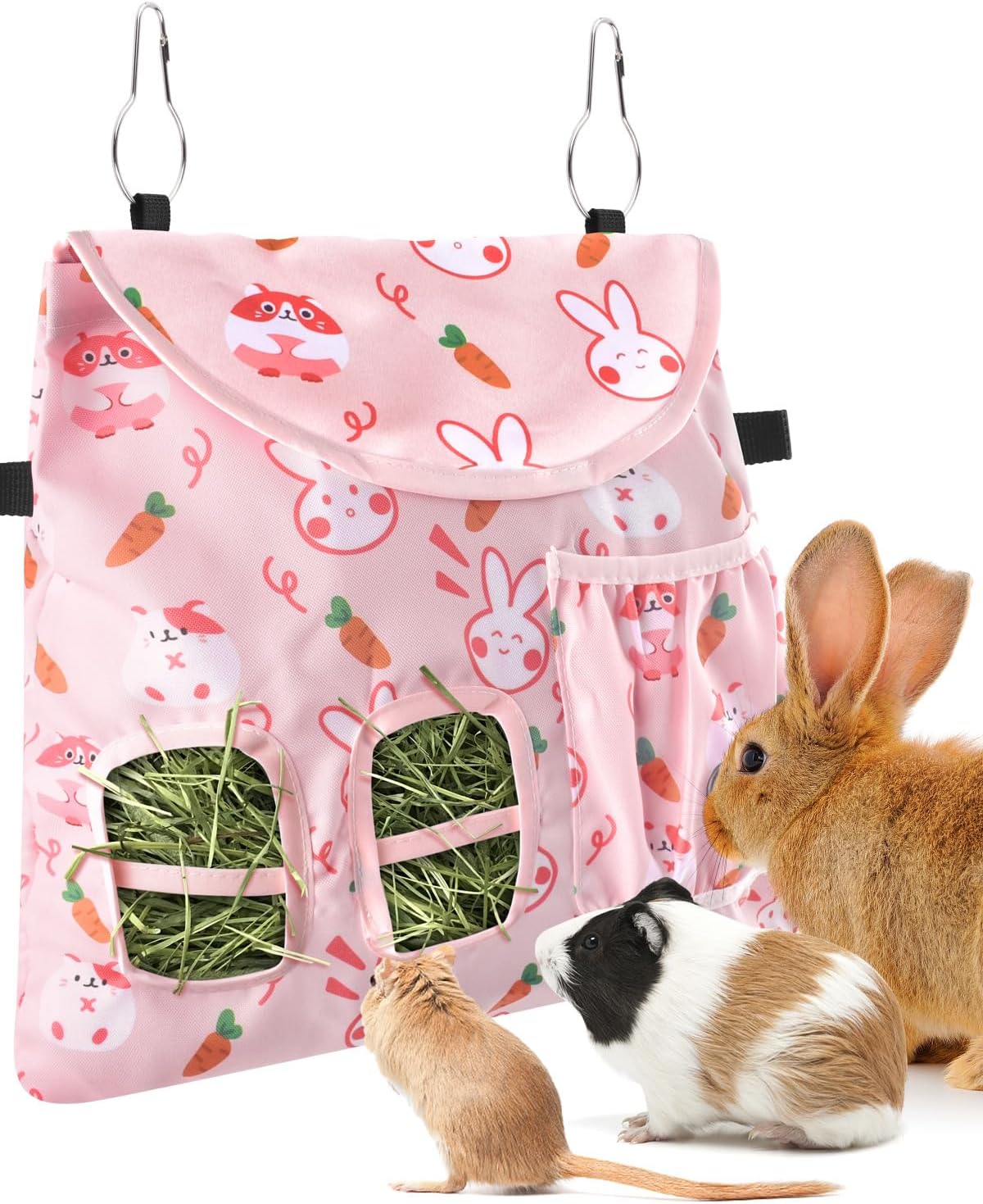 Bissap Rabbit Hay Feeder Bag, 2 Holes Hanging Hay Feeder Guinea Pig Hay Bag with Side Pocket for Rabbits Bunny Chinchillas Hamsters Rats and Other Small Pets Small Animal – Pink