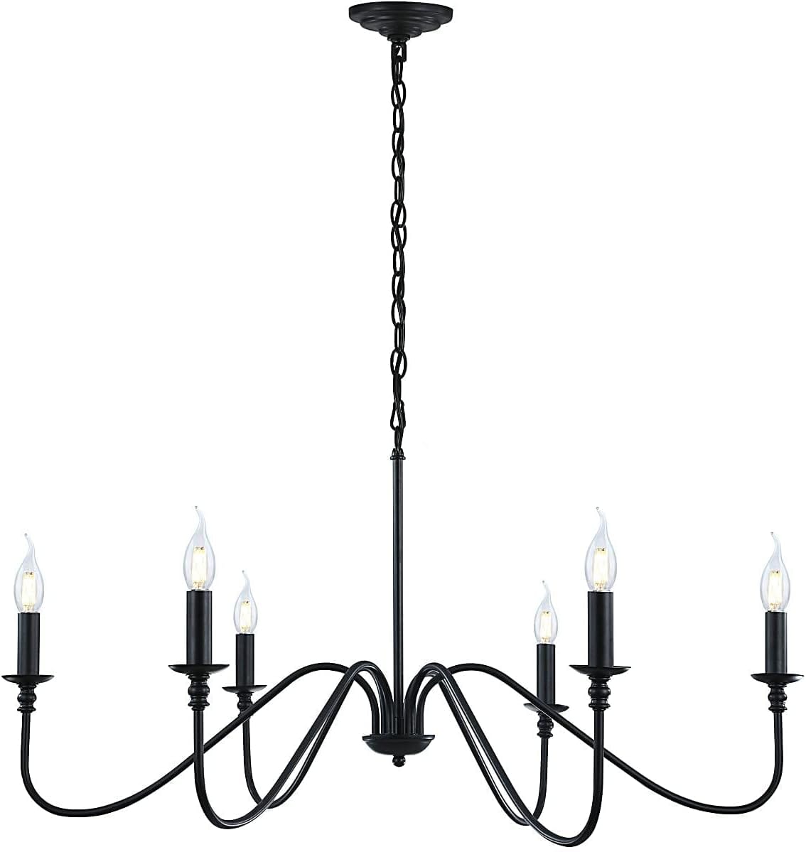 - This classic candelabra chandelier has 6 elegant arms and a matte black finish. It’s a simple design that provides a charming and elegant atmosphere.