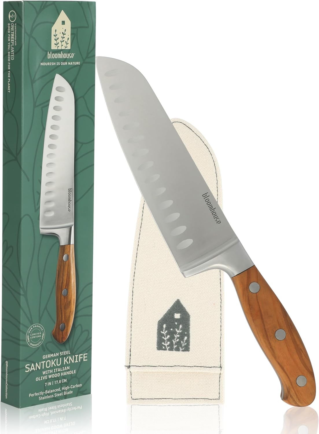 Bloomhouse – Two Time Oprah’s Favorite Things Winner – 7-Inch Santoku Knife German Stainless Steel Blade with Forged Italian Olive Wood Handle, Full Tang Kitchen Knife for Slicing Dicing & Mincing