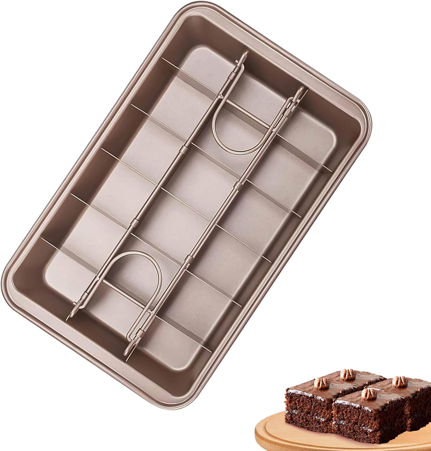 - 【Easy to Use】This cake mould comes with a removable divider, you can make 18 perfectly sliced brownies at a time, making perfect and even sized brownies, what’s more, you can bake 18 different cakes or foods separately in one pan, saving you the trouble of using a knife to cut and divide each piece of brownies