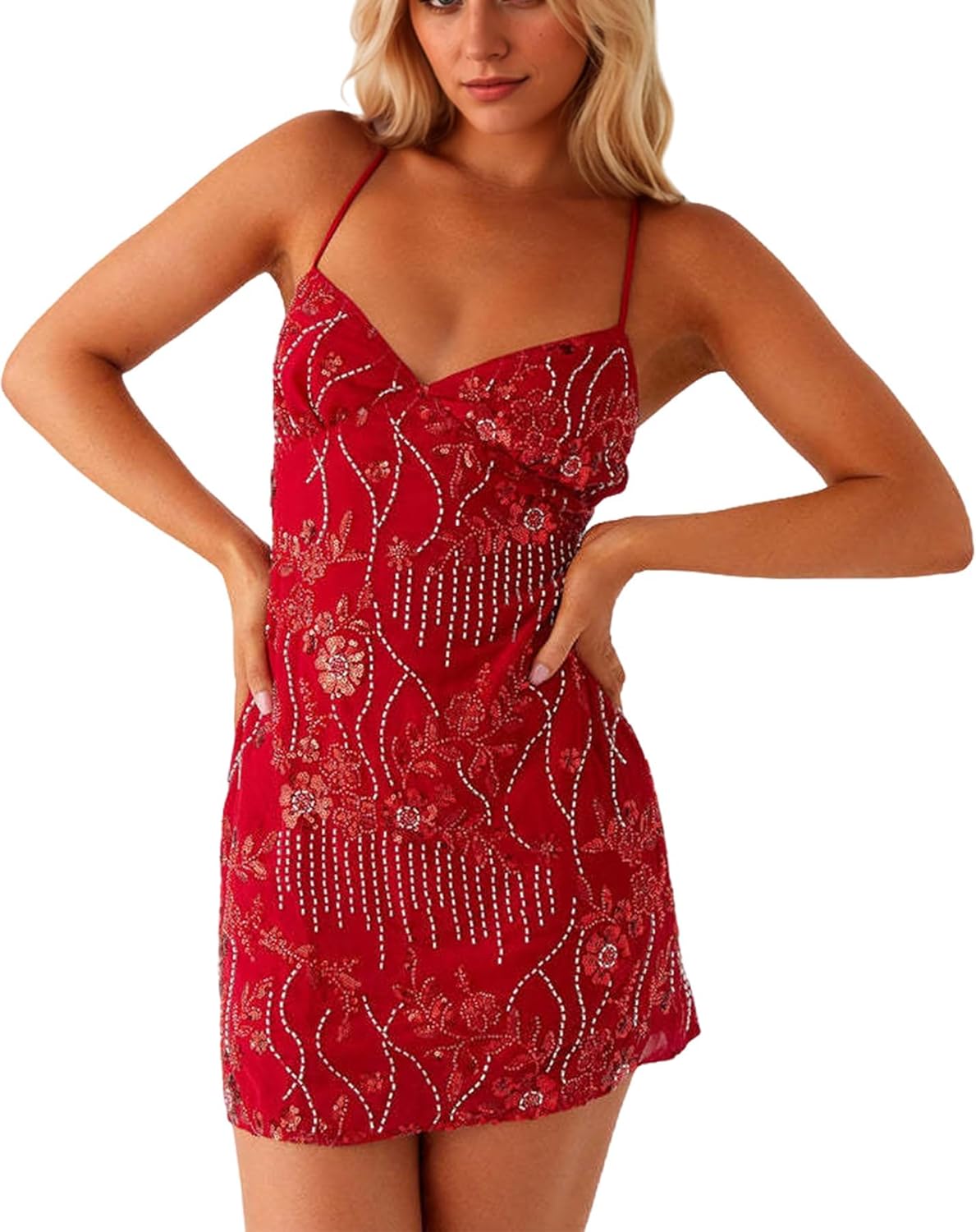 - Design: Boldly deep v neck and criss cross low back designs shows your beautiful body curves well, adding a touch of feminine charm to your look. Shinny sequin and floral beaded rhinestone embroidery make you stand out from the crowd. With mini length design, this sleeveless backless sequin dress can make you look taller in visual. Chic bodycon open back sparkly nigh out cocktail dress will be your ideal choice as gift for yourself or friends