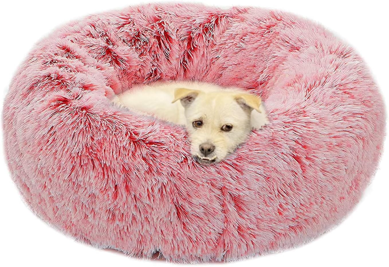Calming Cat Bed, Soft Round Cuddler Dog Beds Fluffy Plush Faux Fur Pet Beds, Anit-Anxiety Self-Warming Comfy (20″, Dark Pink)