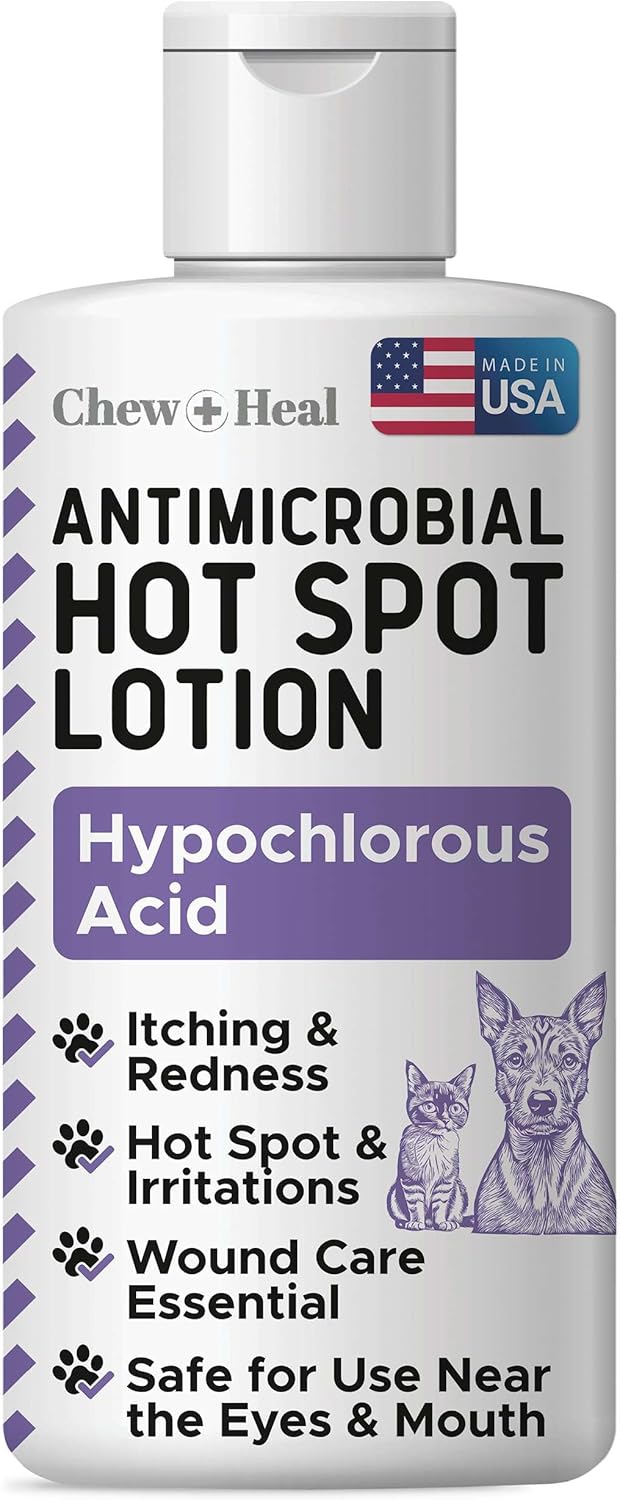 - Chew + Heal’s pet wound lotion contains hypochlorous acid, which aids with healing wounds, reducing redness and itching, and more.