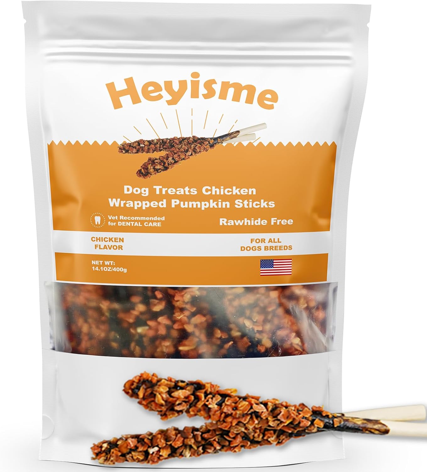 - Health-Boosting Dog Treats – HEYISME chicken wrapped sticks pumpkin dog treats are rawhide Free and rich in protein and vital nutrients from chicken, which is easier to digest than beef or pork, and are low in fat, making them ideal for sensitive systems, dog dental care and dog teeth cleaning.Proudly made in USA. 14.1oz Large portion size.