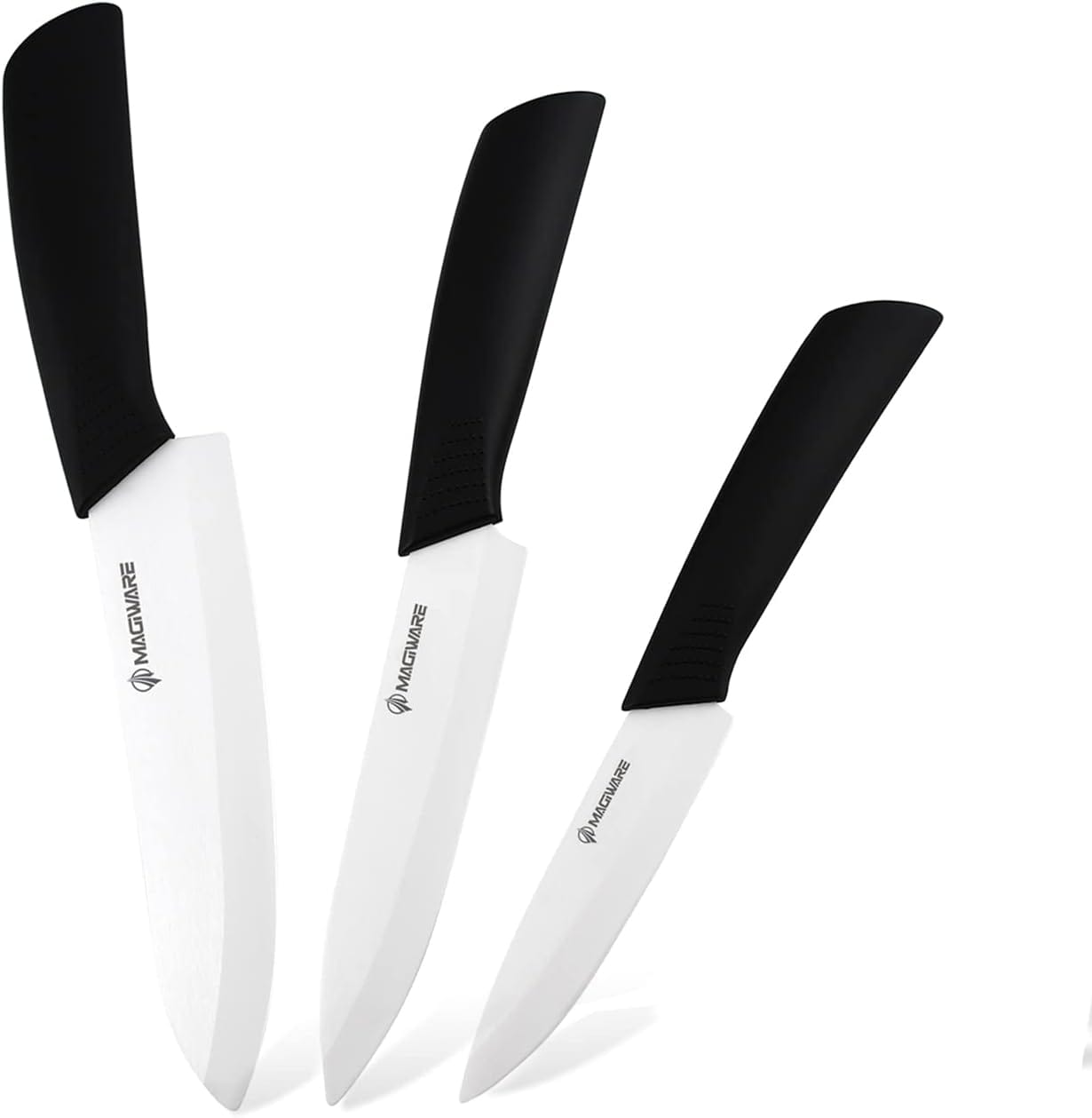 - 【High Quality and Sharp】: Magiware Ceramic Knives are made of the highest quality zirconia under 300 metric ton pressure and 2000 centigrade high temperature. Each blade is so hard as diamond and sharp longer, the knive set of 3 suit for all kinds of kitchen task