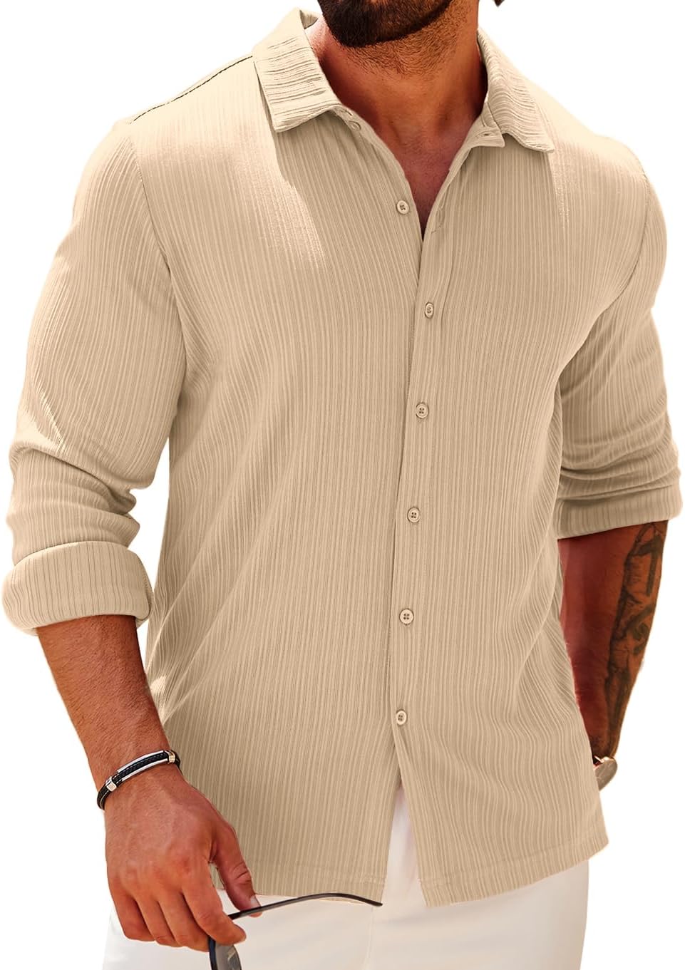 - [Unique Textured]: Our ribbed textured button up shirt is made of premium knit fabric, which is soft, breathable, and super stretch. The thickness is just right, never feels bulky.
