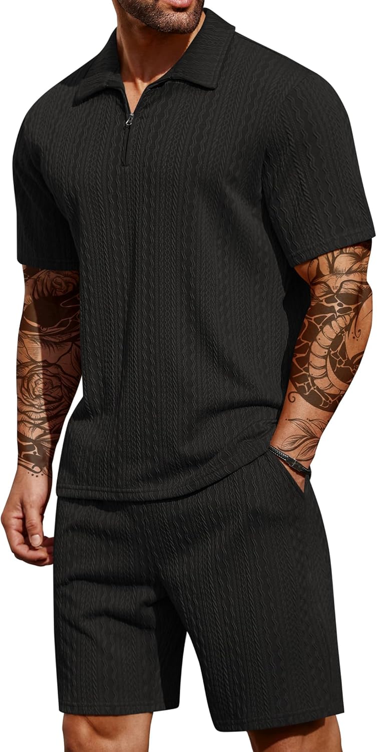 - 【Quarter Zip Polo Shirt Set】This short-sleeve polo shirt is designed with delicate 1/4 metal zipper, turn down collar, short sleeve, cut off hem, Knitted design. The mens casual shorts is designed with adjustable drawstring waist, and two slants pockets