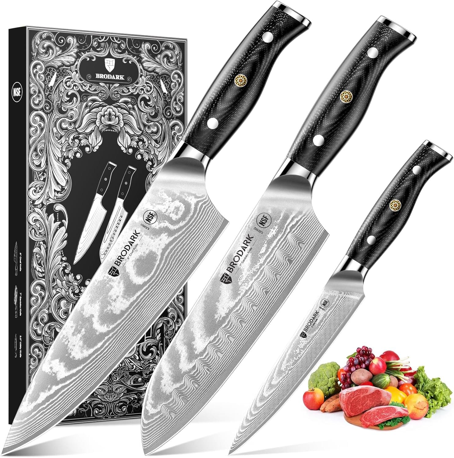 - All-in-one Complete Set: Damascus knife set 3 PCS-8″ Chef Knife, 7″ Santoku Knife, 5.5″ Utility Knife, which is NSF standard, you cut safer and more securely. The professional chef knife set easily handle all your kitchen tasks