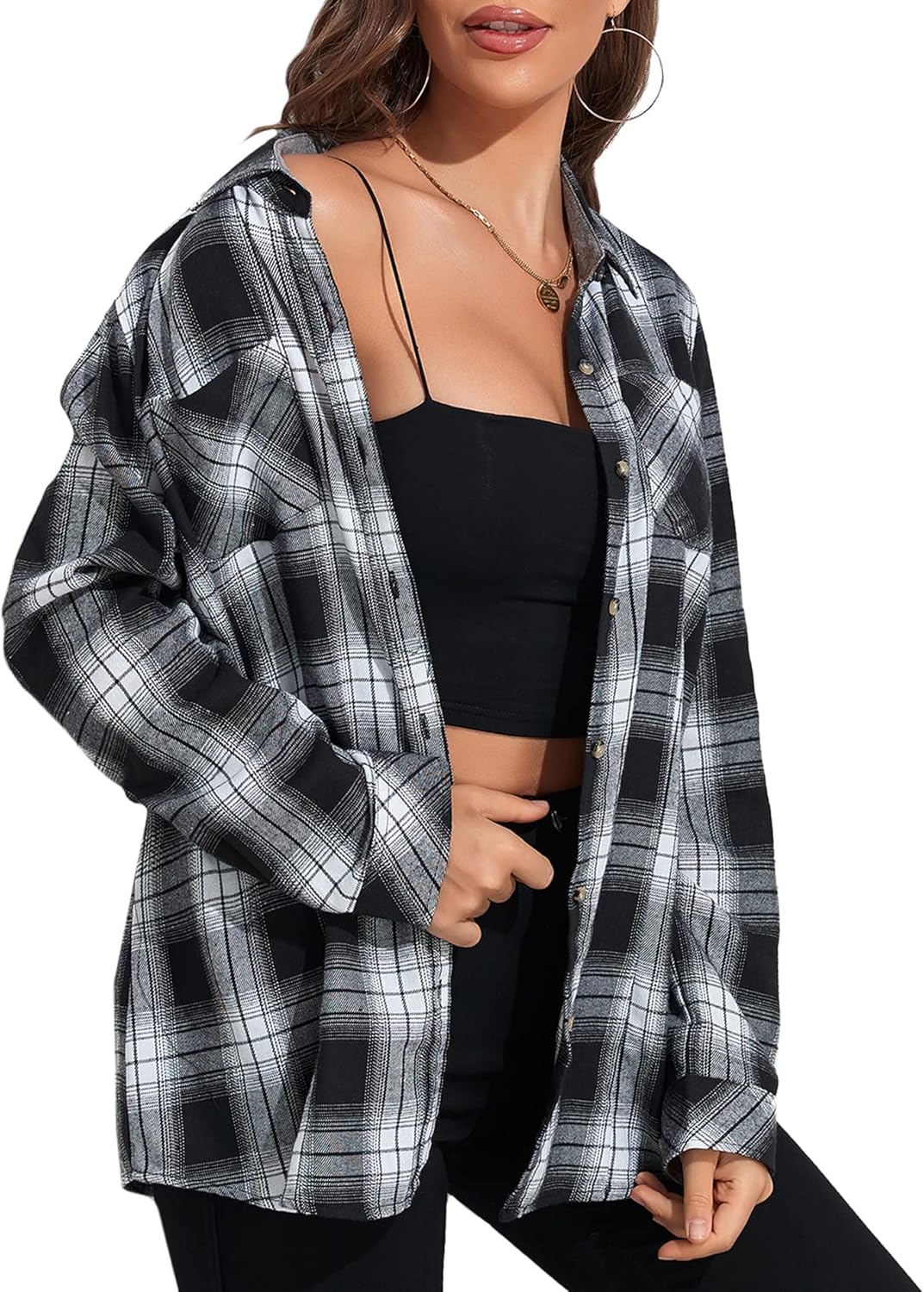 - Button Down & Pocket— This checkered flannel blouses shirts for women comes with TWO Chest Pockets, you can stash any essentials in it such as keys and cards. Turn down collared shirt, single-breasted button front, arc hem, long sleeves with button closure cuffs, drop shoulders, oversized fit.