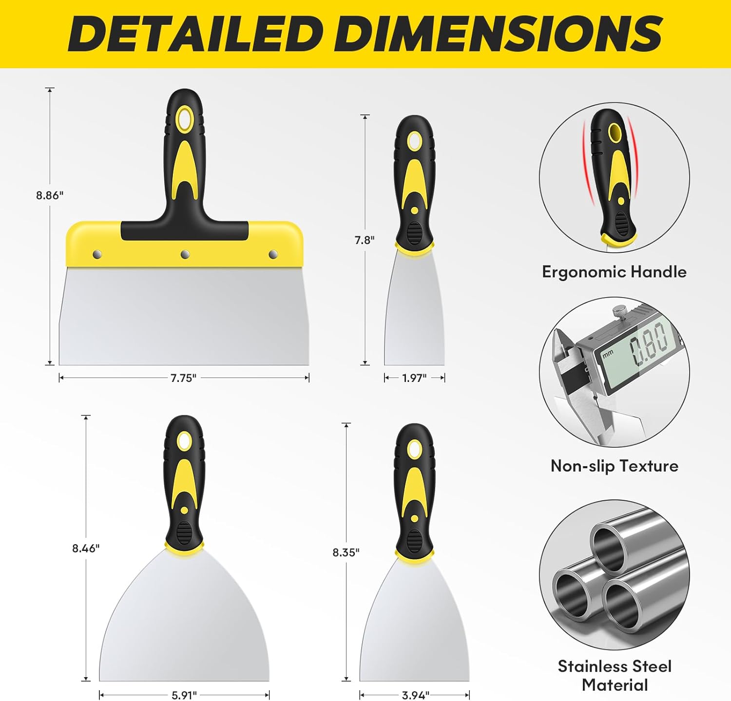 - Versatile Sizes: This putty knife set includes four paint scrapers in sizes 2″, 4″, 6″, and 8″. With these different sizes, you can easily meet all your daily work needs. The smaller sizes are ideal for applying adhesives and drywall tape, while the larger sizes are perfect for applying putty, plaster, and other home improvement works, meeting your different requirements