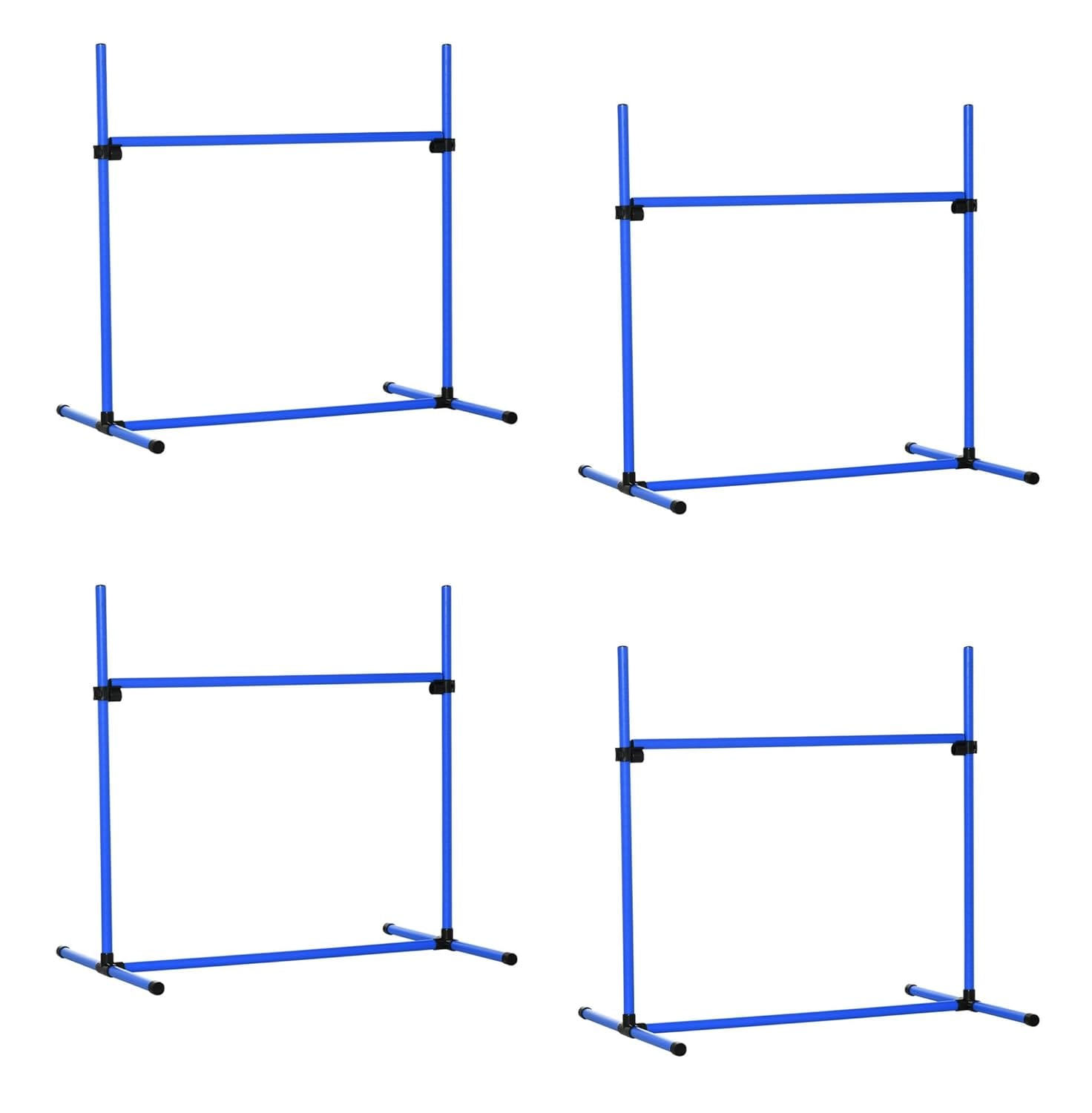 Enhance your dog’s training and fitness with this complete 4-piece dog agility training kit; designed for fun and effective exercise, this set includes four adjustable jump bars perfect for various skill levels and dog sizes; easily set up this obstacle course in your backyard, at the park, or take it on the go with the included carry bag for convenient storage and transport; the adjustable height feature allows customization to suit your dogs abilities, promoting confidence and improving agility; the durable construction ensures stability on multiple surfaces, including grass, dirt, and concrete, making it a versatile training tool; each jump measures 39 L x 25.5 W x 37 H, providing ample space for your dog to navigate; this agility kit is ideal for puppies, adult dogs, and all breeds, offering a stimulating and engaging activity for both you and your canine companion; the kit is designed to improve your dogs speed, coordination, and obedience, making training enjoyable and rewarding; the secure clip system for height adjustment guarantees safe and reliable performance during training sessions; the set promotes mental stimulation and physical activity, helping to reduce boredom and anxiety in your dog; the lightweight design and compact carry bag make it easy to transport and store; this agility course is a fantastic way to bond with your pet while improving their overall health and well-being; the bright blue color adds a vibrant touch to your training area, making it visually appealing for both you and your dog; the sturdy base of each jump provides stability, preventing tipping or wobbling during use; the kit is made from durable, weather-resistant materials, ensuring long-lasting performance; enjoy countless hours of fun and exercise with this versatile and portable dog agility training kit.