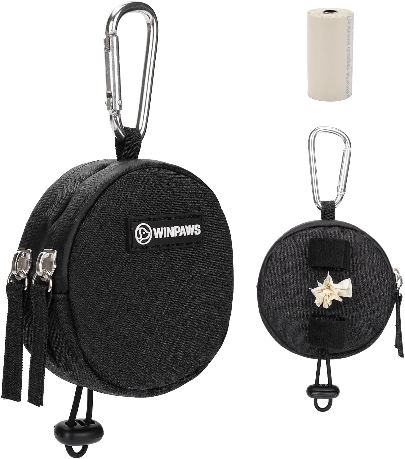 Dog Poop Bag Holder for Leashes- Dog Treat Pouch with Waterproof Zipper,Puppy Training Small Bag with Carabiner & Bungee Toggle,Two Pockets for Dry or Wet Treats-Pet Travel Walking Essentials (Black)