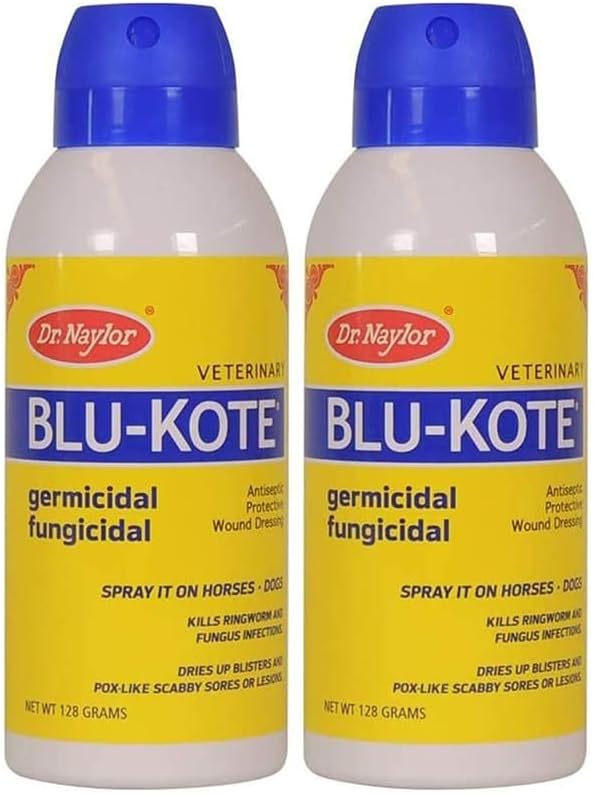 Dr. Naylor Blu-Kote Aerosol (128 grams) – Fast Drying Antiseptic Wound Dressing Pack of 2 4.5 oz aerosol spray. Fast Drying Antiseptic Wound Dressing. Dog and horse wound care spray. Useful as a marking agent for animals and in treating..