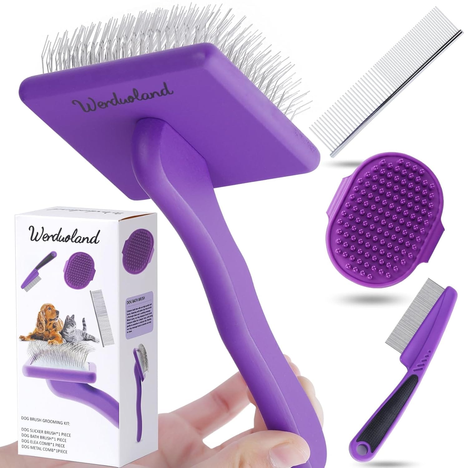 • 【Long Pin Slicker Brush for Dog】Werduoland pet slicker brush has unique design longer, denser and softer stainless steel pins penetrate deep into the coat with 25mm total 270+ needles. All tools are with rounded teeth soft to skin. This cat brush set are all designed with ergonomic, anti-slip and durable handle. This slicker brush for dogs and cats safe and effective, enjoy a comfortable grip that helps prevent use pet grooming brushing fatigue.