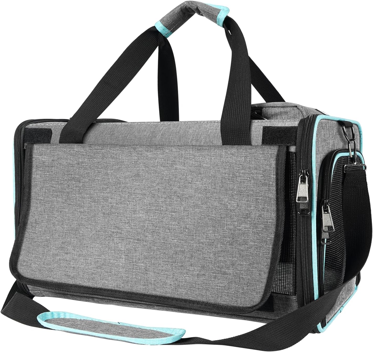 - High-quality 600D Oxford cloth fabric along with the sturdy interior steel frame for durable construction. Roll-up mesh top entrance with Velcro and side zippered openings make it easy to load your kitty and provide a stress-free travel environment