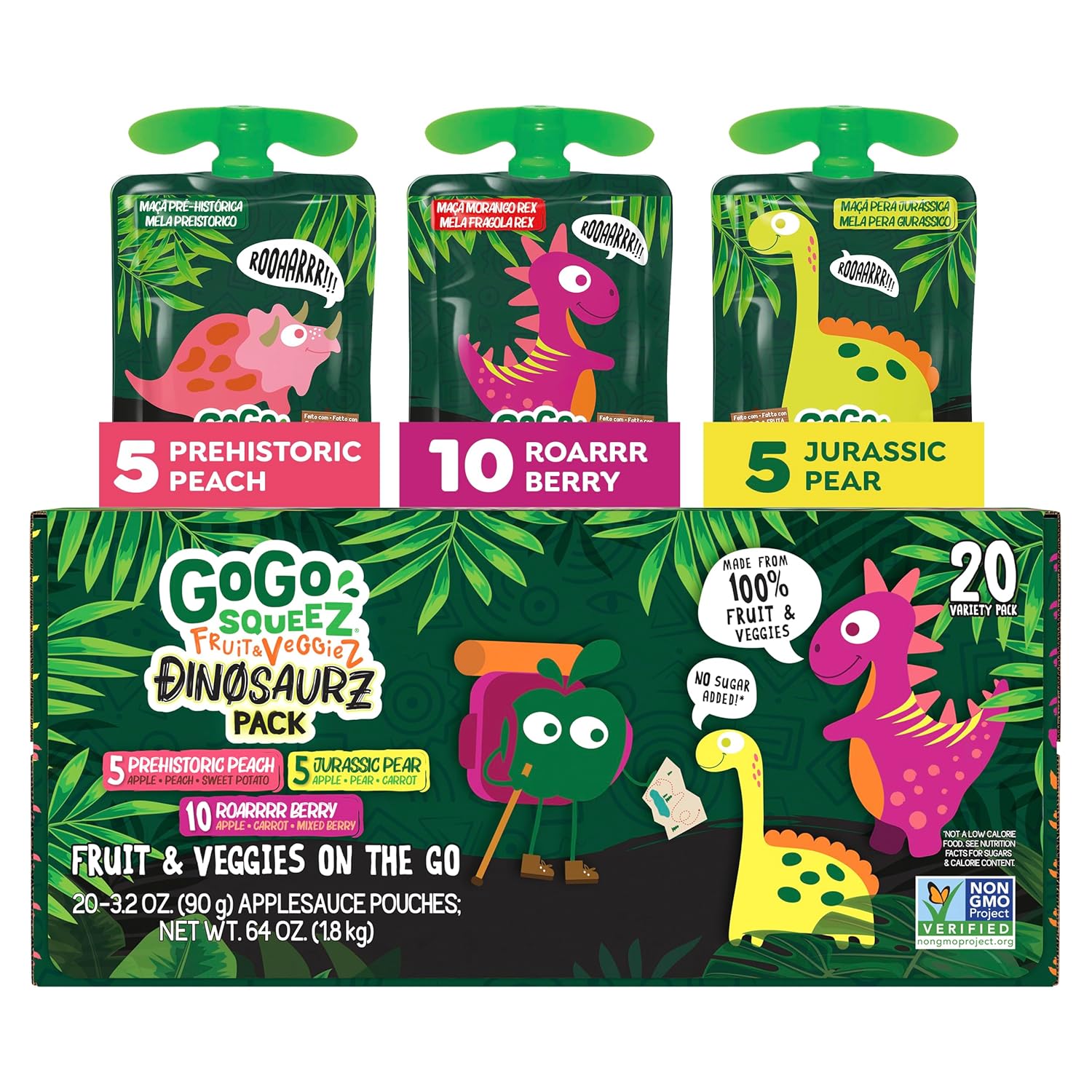 GoGo squeeZ Fruit & veggieZ Applesauce and Puree Variety Pack, Jurassic Pear, Roarrrr Berry & Prehistoric Peach, 3.2 oz (Pack of 20), Unsweetened Snacks for Kids, BPA Free Pouches