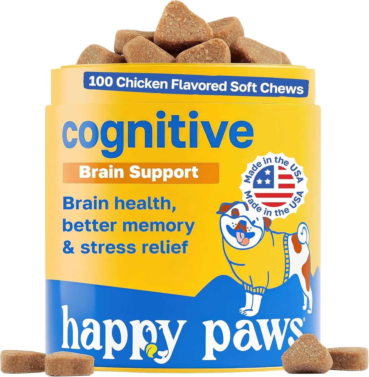Happy Paws Cognitive Supplement for Dogs, Chicken Soft Chews with Taurine, Spirulina, CoQ10 & Vitamins B1, B3, B12, Supports Cognitive Function, Memory and Focus, Chews for Small to Large Dogs