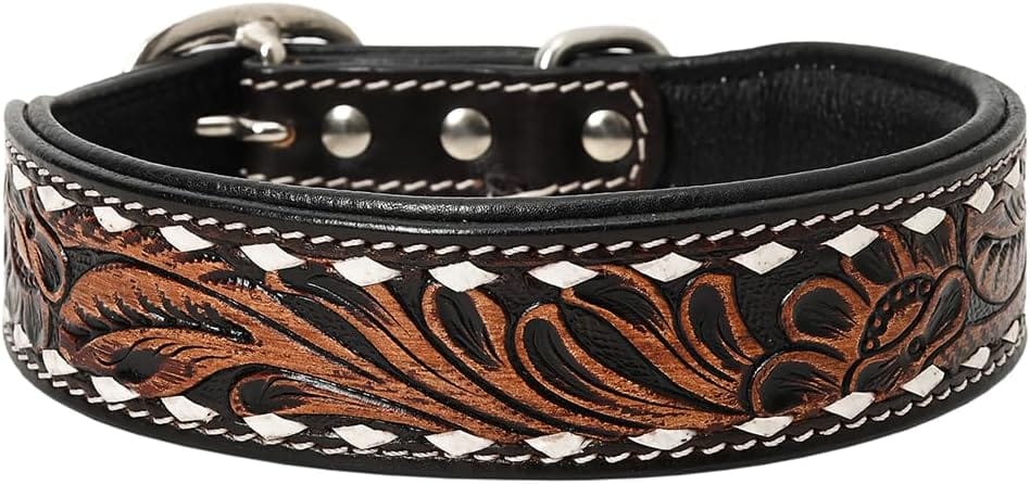 Hilason Buckstitch Floral Hand Tooled Strong Genuine Leather Dog Collar Brown Medium