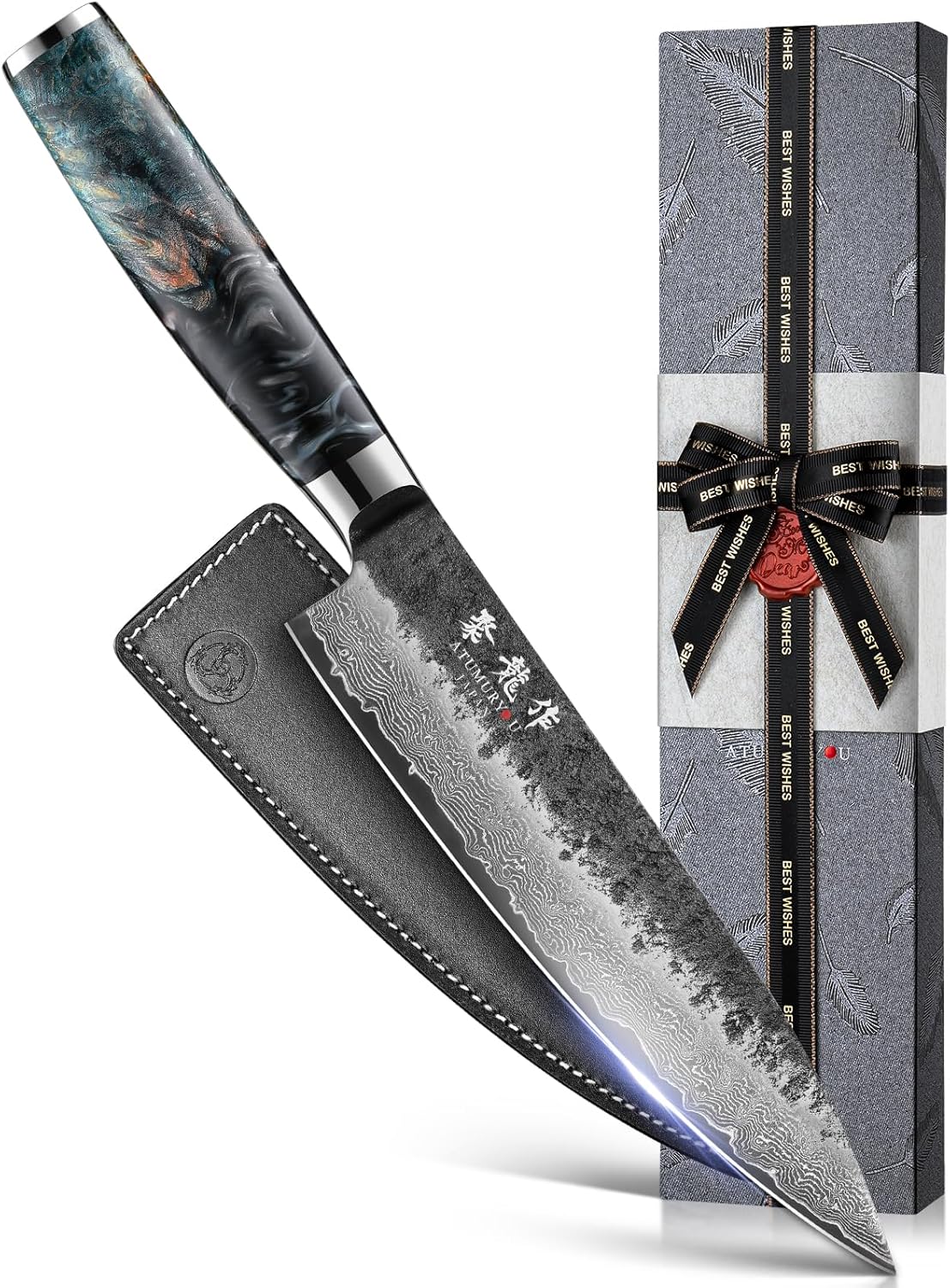 - 【Traditional Japanese Craftsmanship】Our chefs knife is crafted from premium Japanese VG10 Damascus steel with a Rockwell hardness of 62 (62 HRC). Hand-forged by Japanese artisans and featuring a unique black-forged finish. Each chef’s knife delivers unparalleled sharpness and precision