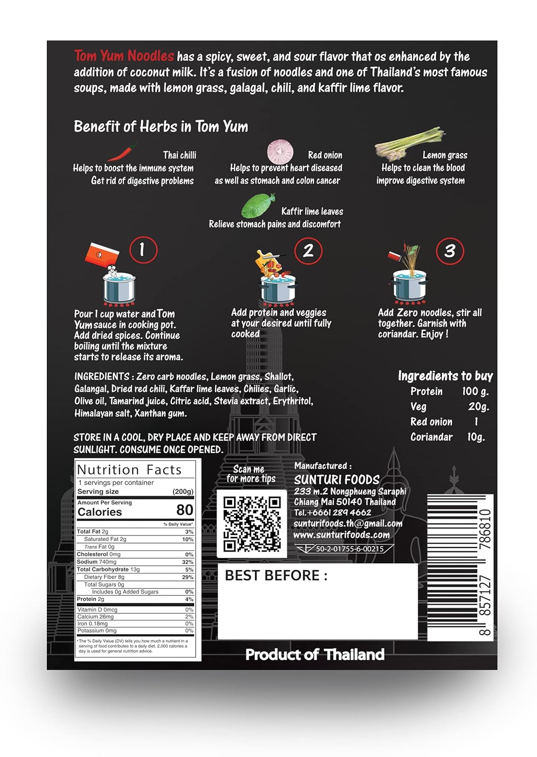 - Authentic Thai Tom Yum Noodle Kit – complete bundle with concentrated sauce, dried herbs, and zero carb noodles made from kale, algae extract. Simply add protein and vegetables for a delicious and aromatic meal.
