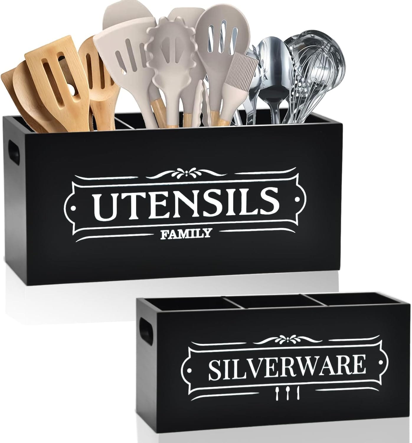 Kitchen Utensil and Silverware Holder Set – Extra Large Wooden Countertop Organizer for Cooking Utensils, Cutlery and Flatware, Farmhouse Kitchen Decor, Silverware Caddy for party (Black, Large)