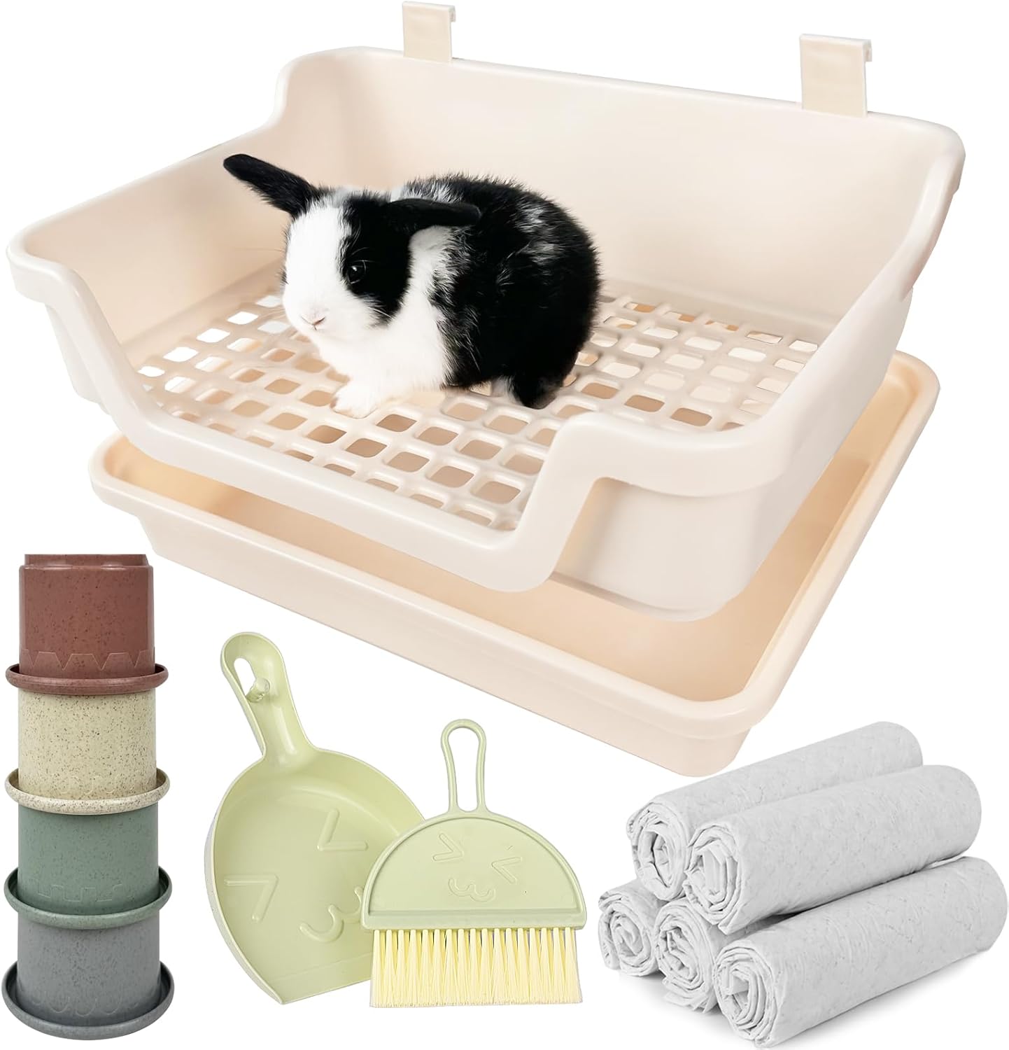- 【Package Include】For the same price, you’ll get 11pcs in total! 1* rabbit litter box. 1*plastic dustpan and broom set, is perfect for sweeping in and around the litter box. 4*random Interesting Rabbit Toys: It can be placed directly on the outdoor lawn or indoor rabbit cage as stacking toys for bunny, in addition, you can also hide diced carrots and other food inside,which can make it active for a long time. And 5 pcs rabbit cage pads,absorbent liners to make clean up even easier!