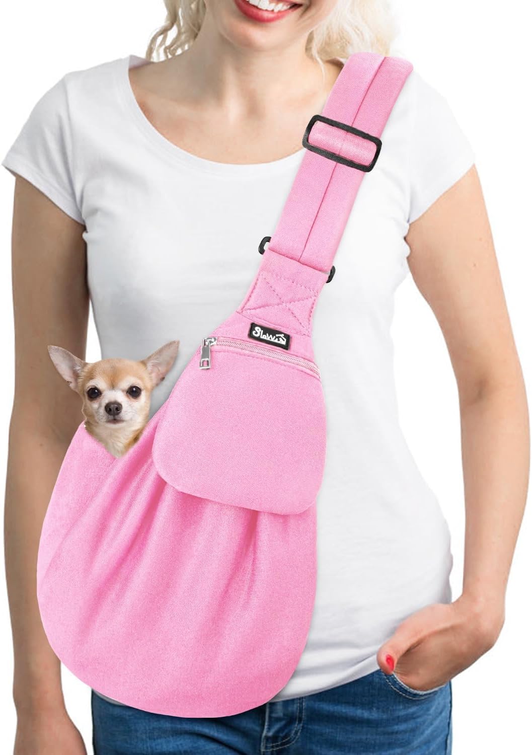 Lukovee Pet Sling, Hand Free Dog Sling Carrier Adjustable Padded Strap Tote Bag, Shoulder Bag with Safety Belt & Front Pocket for Small Dog Cat Puppy (Pink-WY,S)