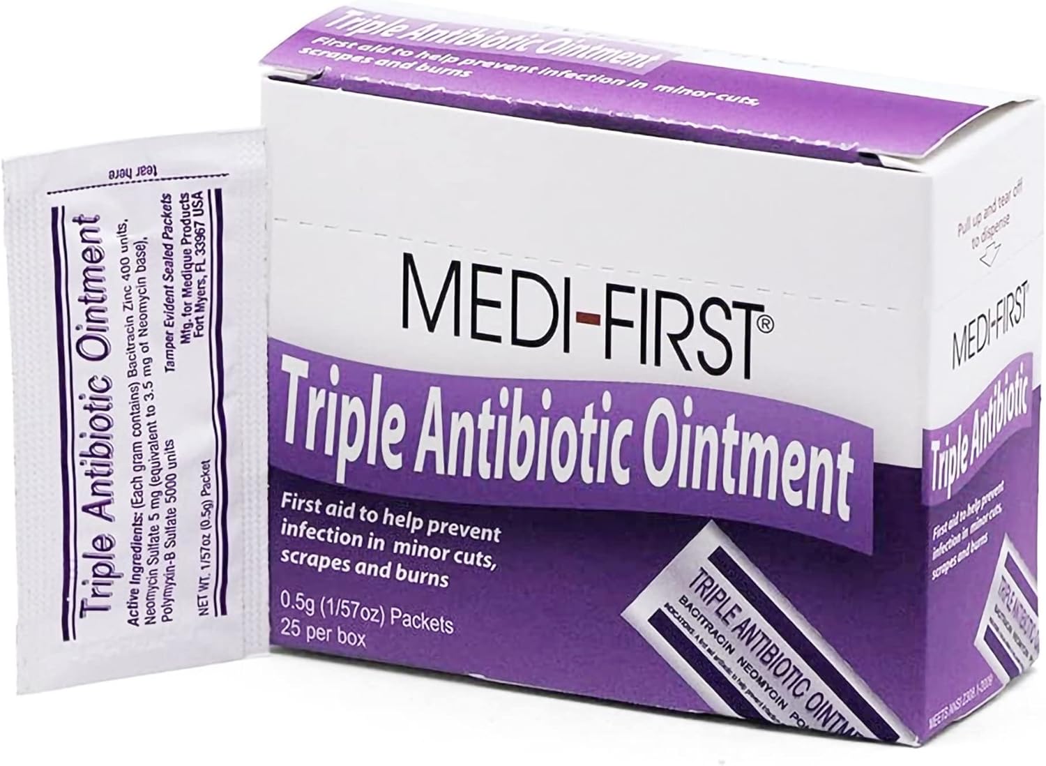 Medi-First First Aid Antibiotic 0.5 Gram Individual Packet Ointment 400 IU – 5 mg – 5,000 IU/Gram Strength, 25 Ct