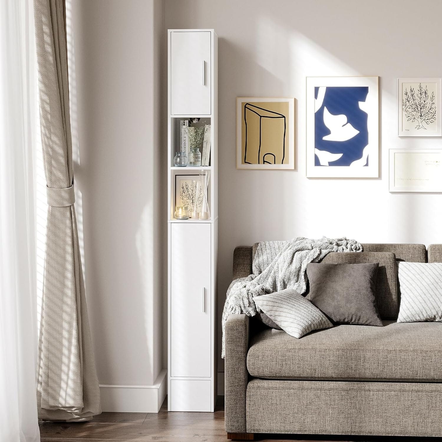 - 20% More Storage Space: The Slim freestanding cabinets measure 9.45’D x 7.87’W x 72.05 “H, adding depth while maintaining a smaller footprint, 20% more storage space than other cabinets, making the most of the space, designed for small spaces, and suitable for corners in bathrooms, living rooms and kitchens