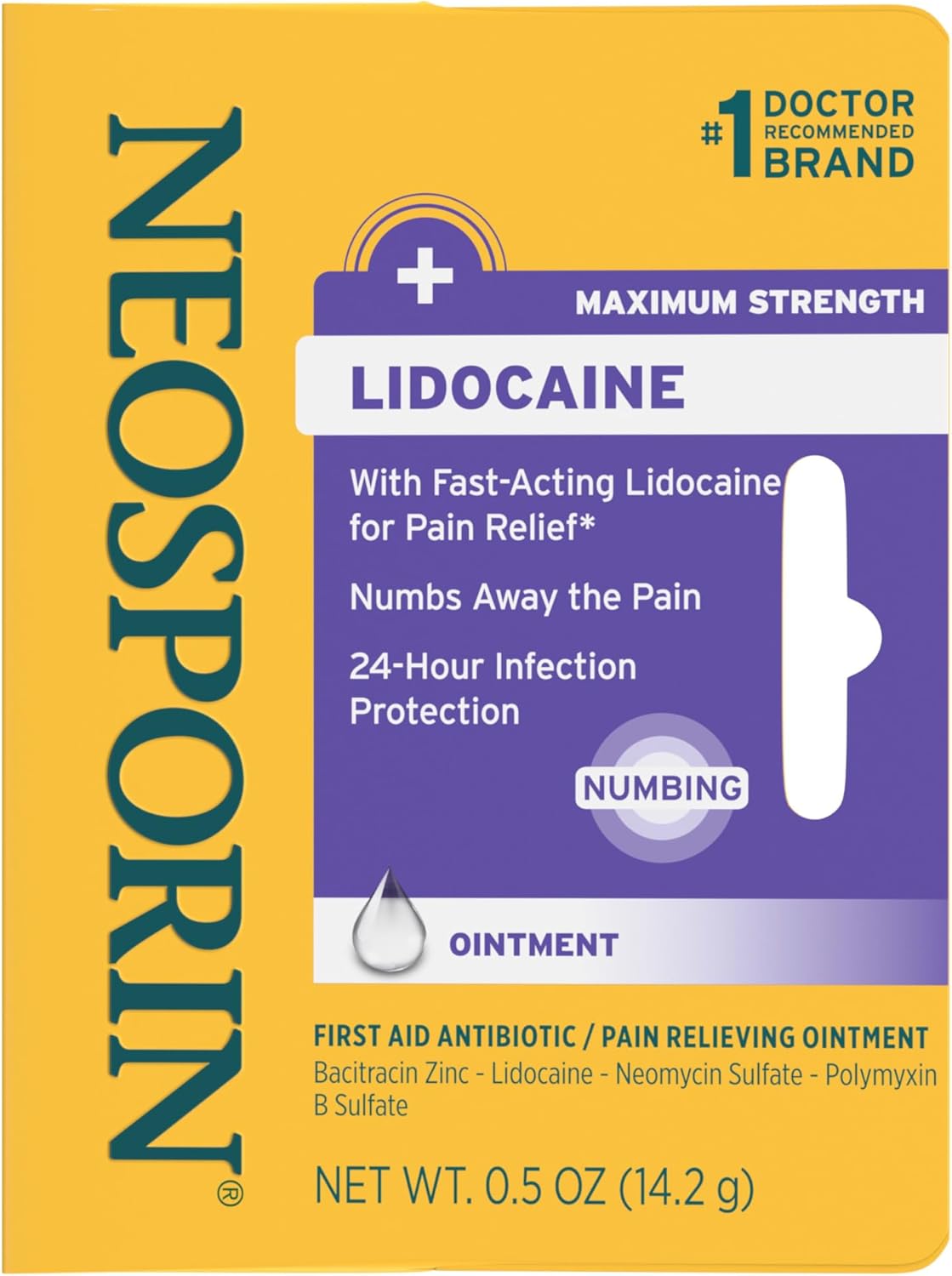 Neosporin + Lidocaine First Aid Triple Antibiotic Ointment, Fast-Acting, Maximum Strength Topical Pain Relief, 24-Hour Infection Protection That Numbs Away The Pain for Minor Wound Care, 0.5 oz
