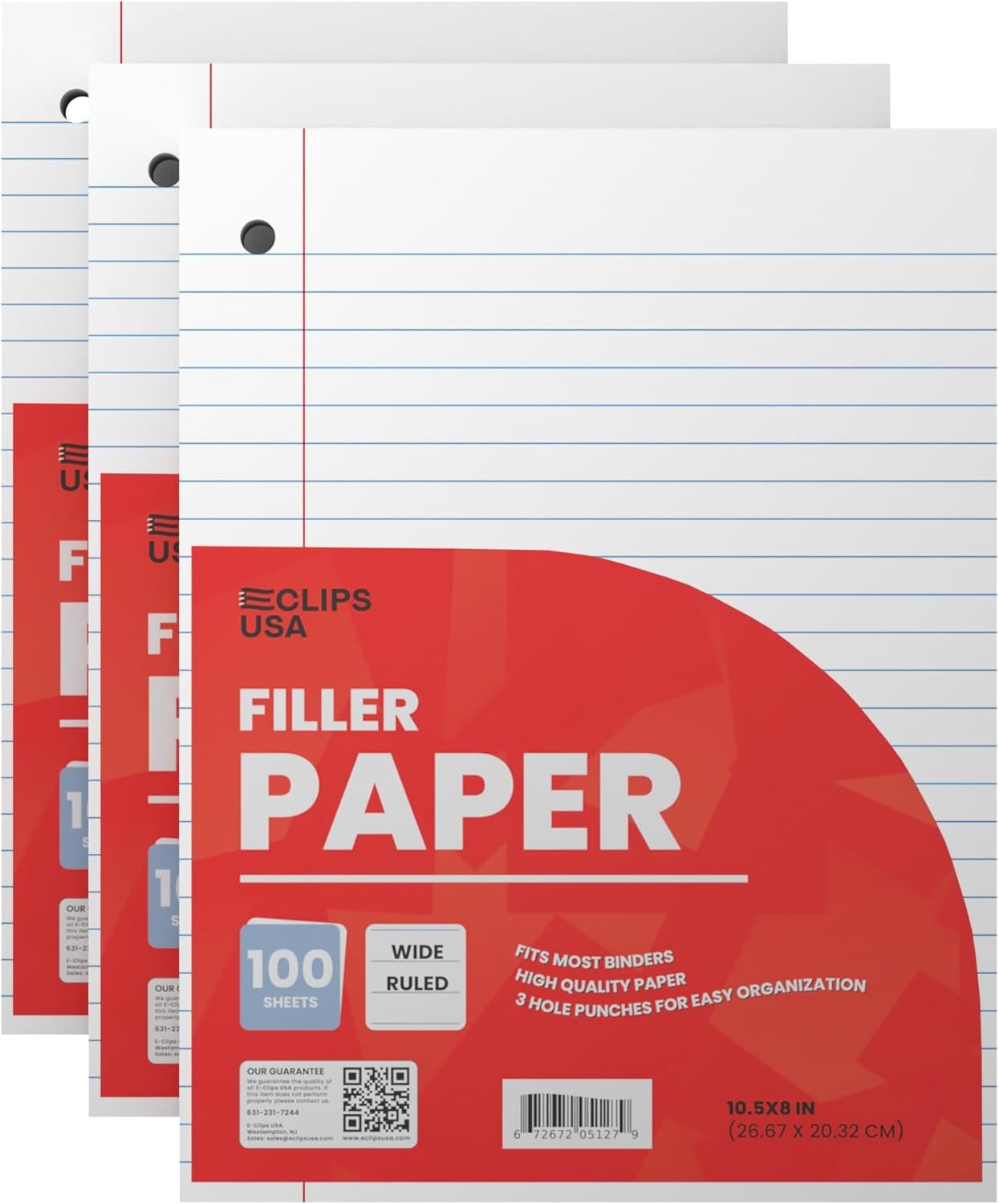 Notebook Paper, Loose Leaf Paper, Wide Ruled Paper, 10.5 x 8, Filler Paper, 100 Sheets Per Pack, 60 gsm (3 Pack)