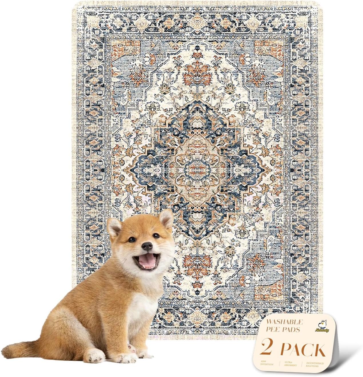 nunubaby Reusable Potty Pads for Dogs for Crates and Floors. Washable Pee Pads for Dogs, Stylish, Non-Slip and Leak-Proof Pee Pads. (Beige/Multi, 18″ x24″)
