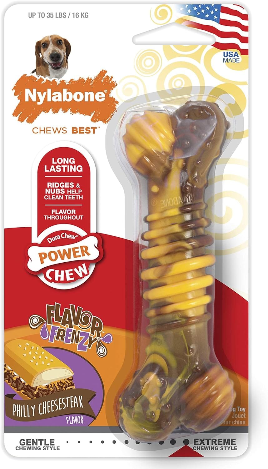 Nylabone Flavor Frenzy Dental Bone Power Chew Toy, Dog Toys for Aggressive Chewers, Philly Cheesesteak, Medium – Up to 35 lbs, 1 Count