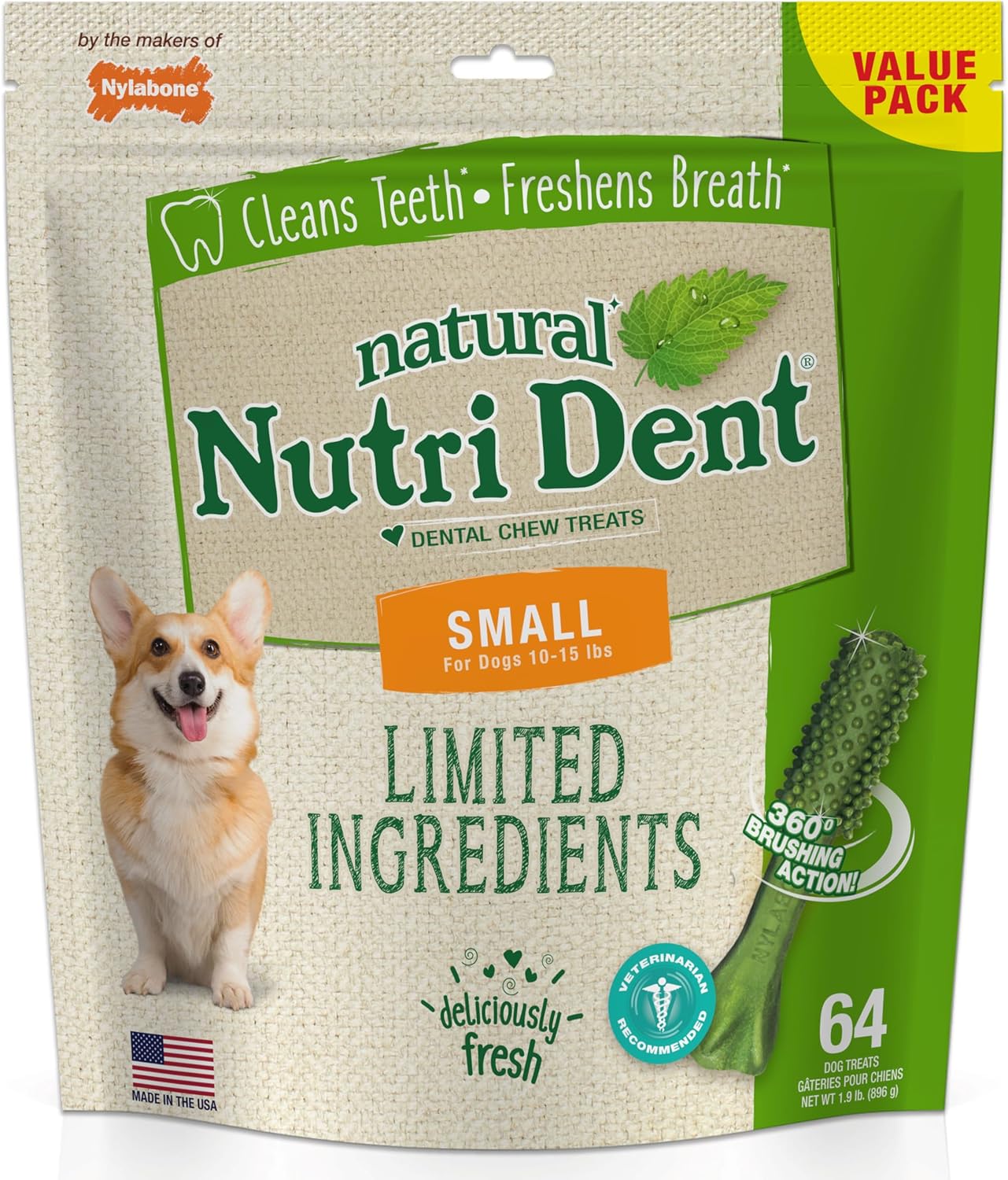 Nylabone Nutri Dent Dog Dental Chews – Natural Dog Teeth Cleaning & Breath Freshener – Dental Treats for Dogs – Fresh Breath Flavor, Small (64 Count)
