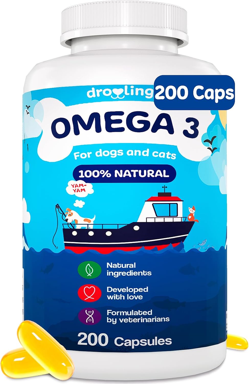 Omega 3 for Dogs and Cats 1000mg 200 Fish Oil Fatty Acids Capsules (180mg EPA + 120mg DHA) Supplement for Skin and Coat Itch Relief and Immune System
