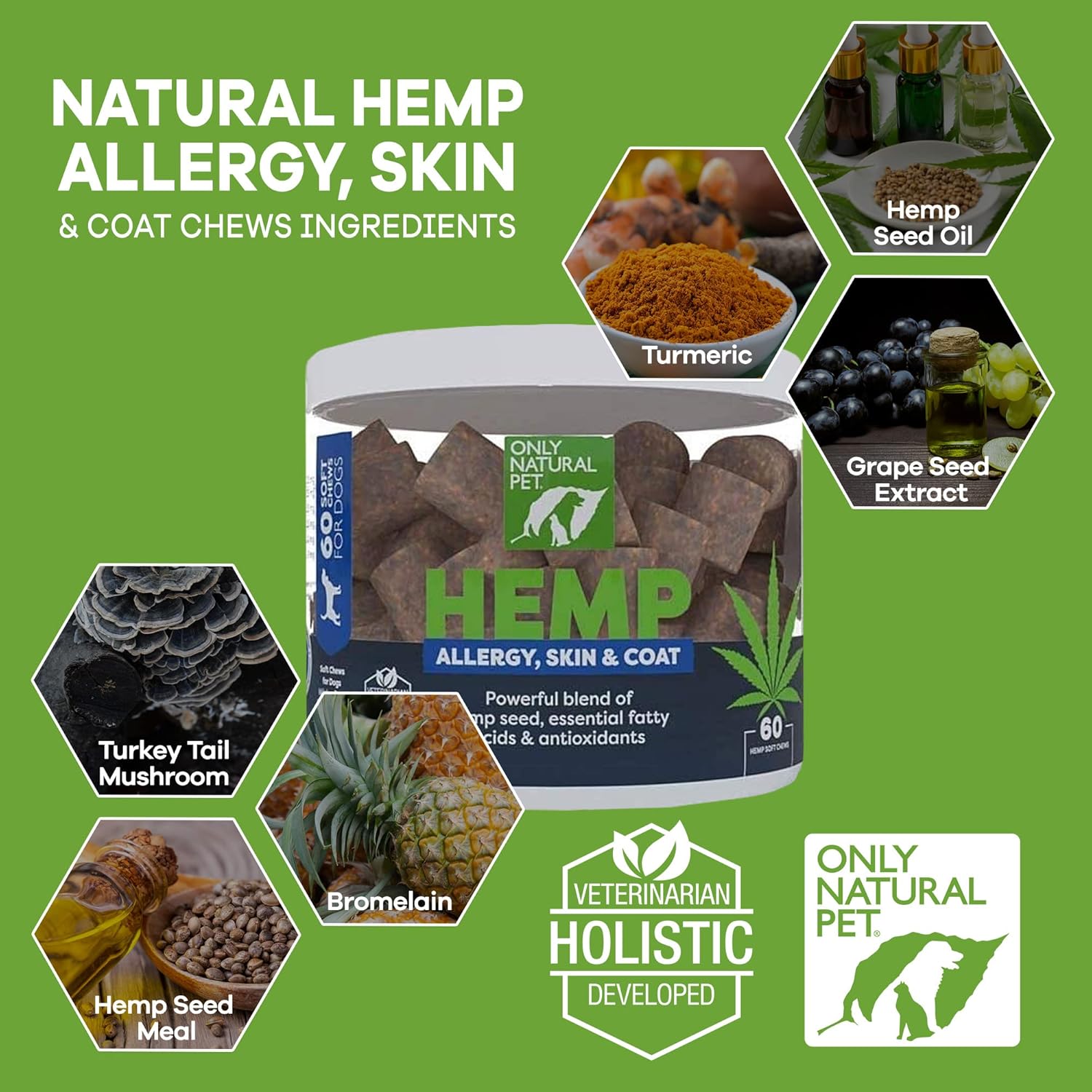 Only Natural Pet Allergy, Skin & Coat Hemp Soft Chews – Allergy Immune Bites for Dogs, Omega 3 Supplement, Calming Treats for Itchy Skin Relief, Hot Spot – (60 Count) (AL.)