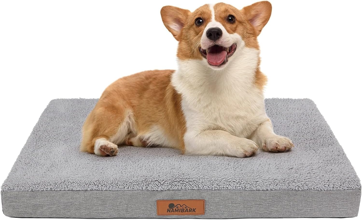 NAMIBARK Premium Orthopedic Dog Bed: Unmatched Comfort, Superior Support, and Stylish Design for Your Furry Friend Is your dog struggling with joint pain or restlessness? Our latest NAMIBARK dog crate pad features premium orthopedic memory foam that evenly distributes weight, effectively relieves joint pressure and quickly regains its shape.Why our dog mattress for crate ? This soft and cozy rectangle dog bed features premium cover with Shu velvet on top, faux linen sides and non-slip bottom cover with L-shaped zipper for easy removal of dog bed washable cover. Our latest inner polyester-taffeta waterproof liner protects the foam from liquids seeping into the dogs bed, ensuring fresh and durable dog bed memory foam, perfect for playful pups. Its 30″x20″x3″ flat dog bed design is ideal as an orthopedic dog bed small or dog bed medium size dog weighing up to 30lbs. Enjoy the outdoor dog bed waterproof feature for indoors, patios, crates, or outdoor adventures.Package Includes: 1 x Premium Crate Dog Bed 1 x Vacuum Sealed PE Bag 1 x Brown BoxHow to Use: 1. Unbox dog bed orthopedic and let it expand for 24 hours, use after it has fully rebounded. 2. Remove the machine washable dog bed cover when needed and tumble dry cover before reassembling for a fresh dog bed crate.Warning: 1. Allow 24 hours for the pet beds for medium dogs to expand fully after unboxing. 2. Keep dog kennel beds for crates away from sharp objects. Give your dog the comfort they deserve with the NAMIBARK Premium dog crate pads and watch them enjoy restful, pain-free sleep every day!